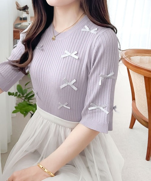 【mily bilet】程よい甘さとレトロムードが愛らしい。リボン使いリブ編みサマーニット mi1029055