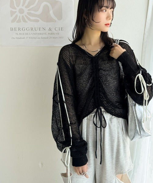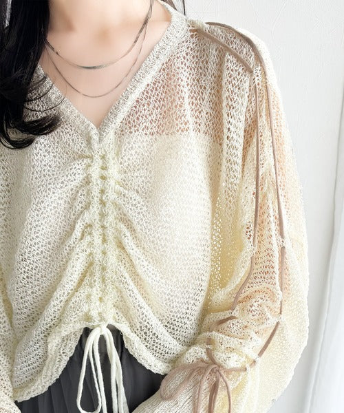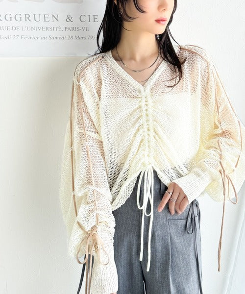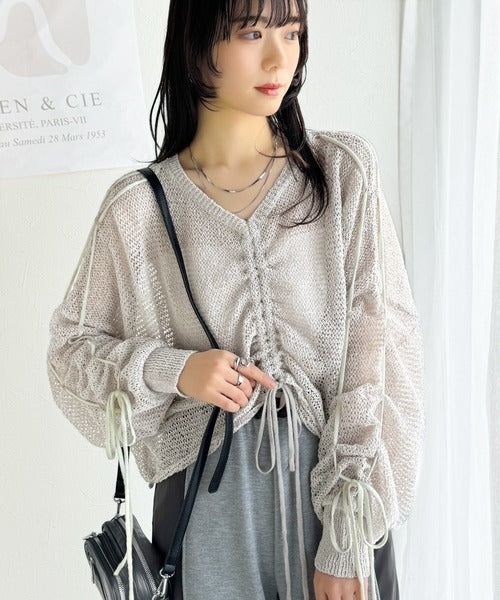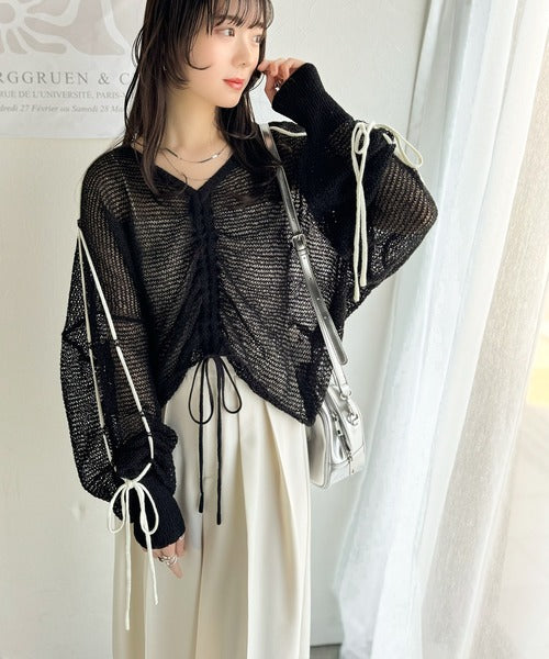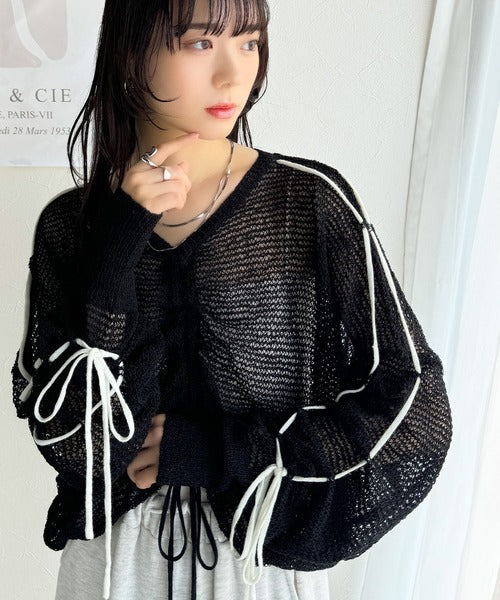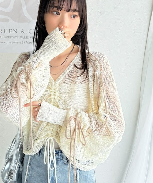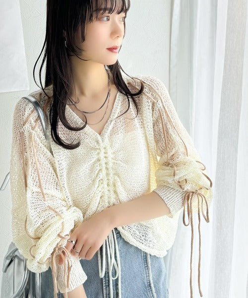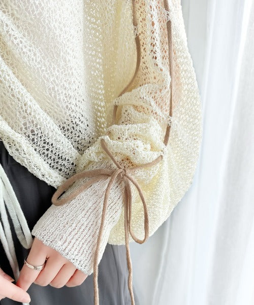 【mily bilet】ルーズな愛らしさで魅了する。透かし編みギャザー仕様リボンプルオーバー(長袖) mi1029102