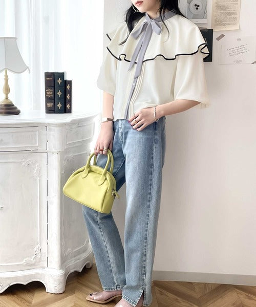 襟元をエレガントに彩るフリルカラーと配色ボウタイで