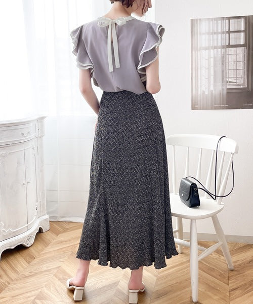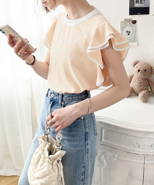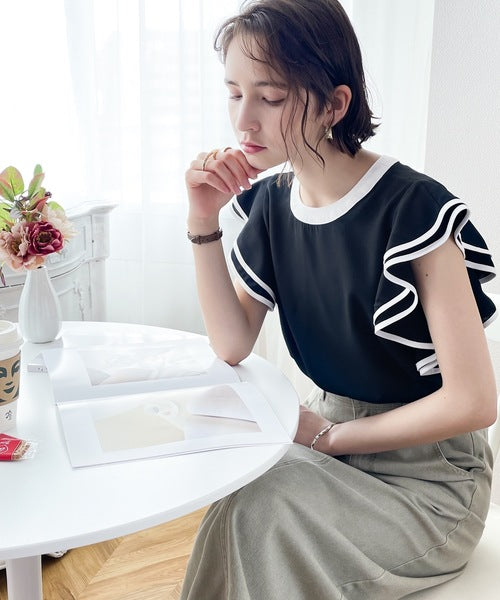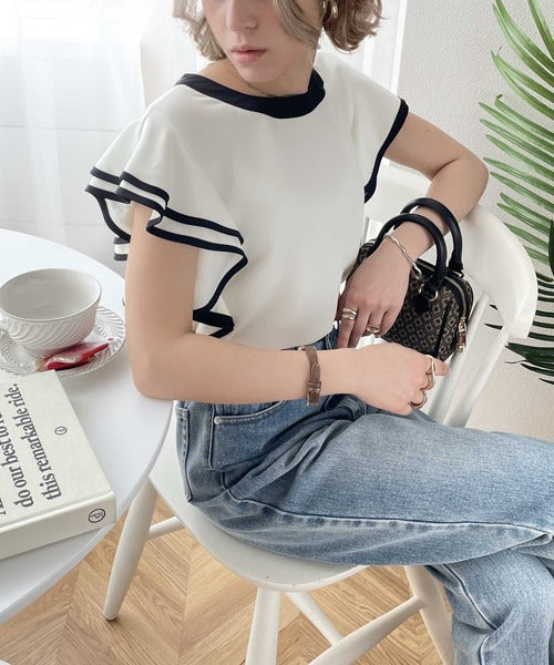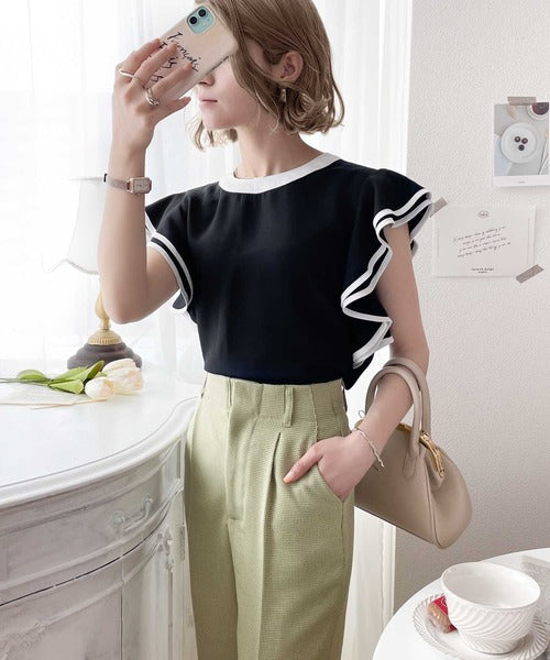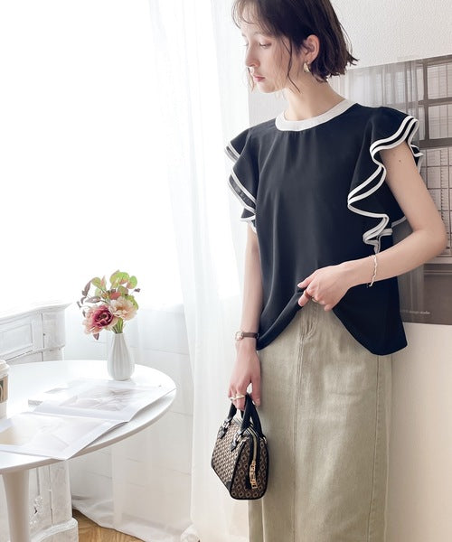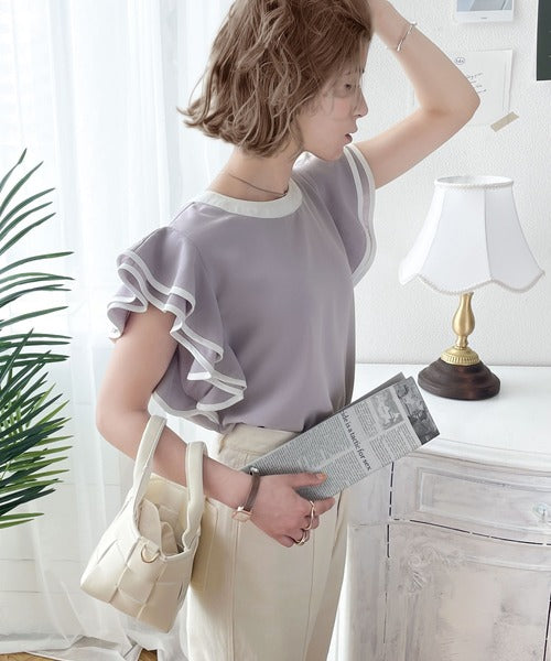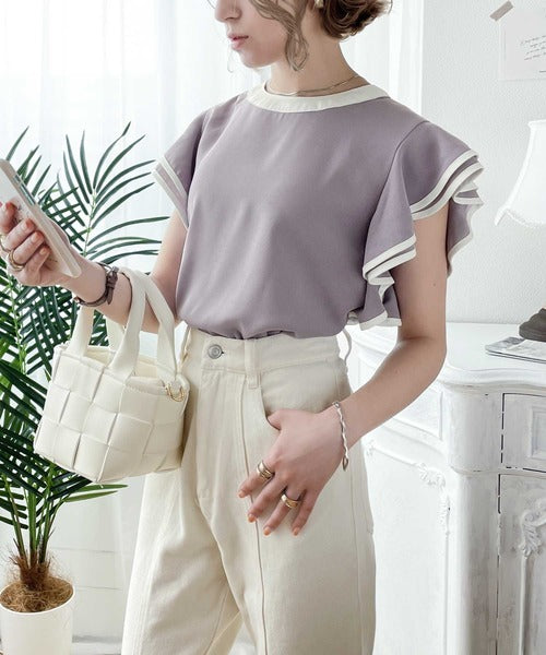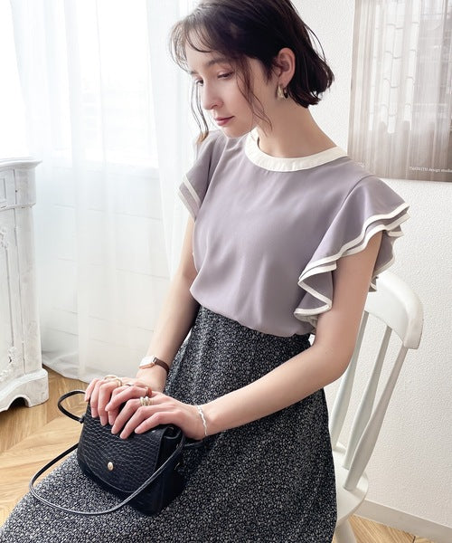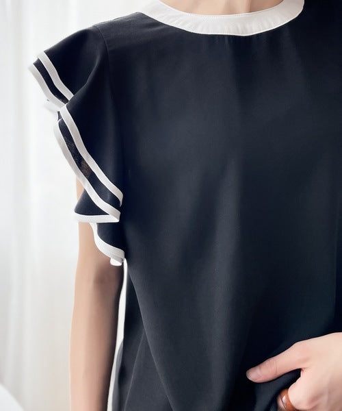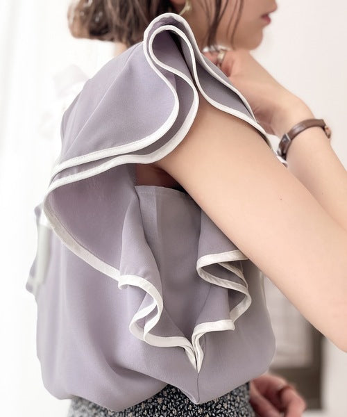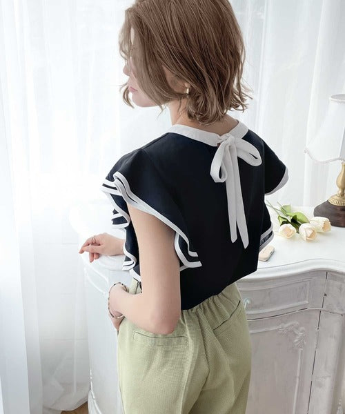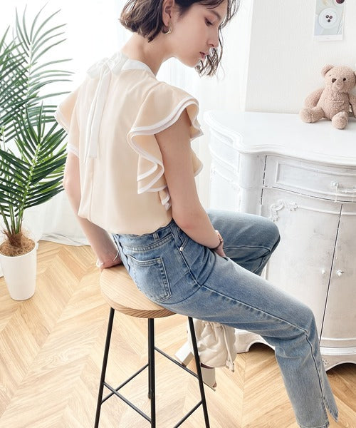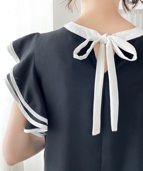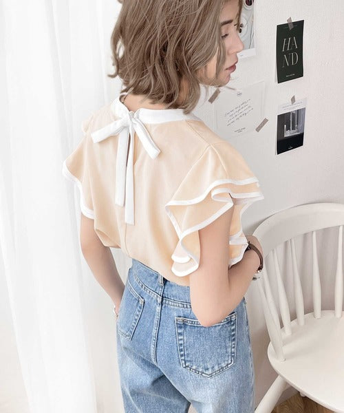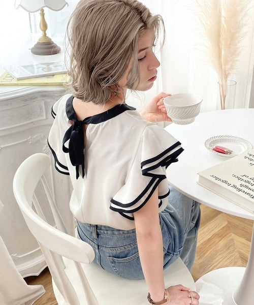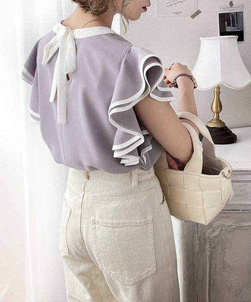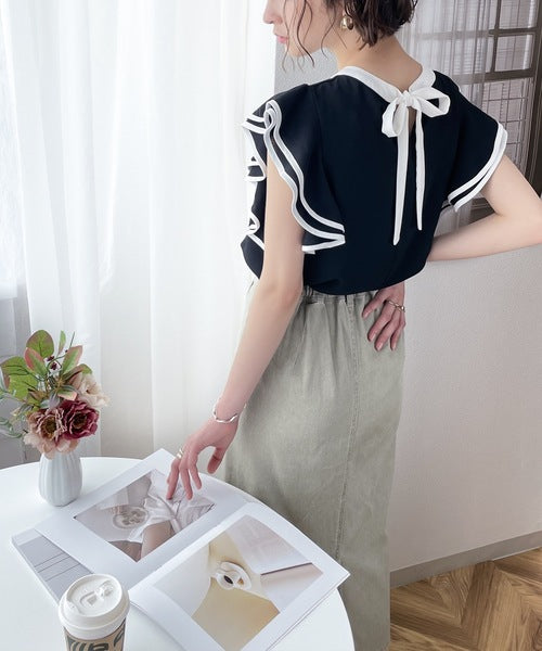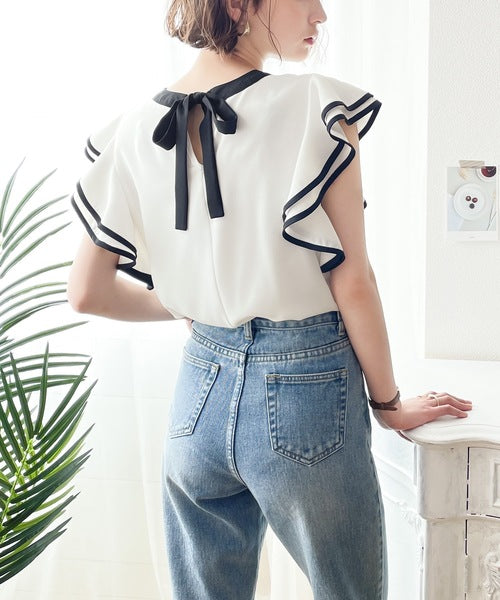 【mily bilet】華奢魅せ♪甘すぎないパイピング配色バックリボンラッフル袖ブラウス mi1139001