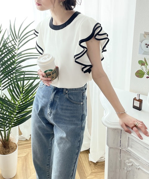 贅沢にあしらわれたダブルのボリュームラッフル袖が印象的な1枚。