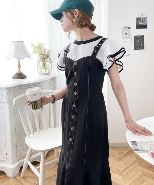 配色パイピングがコーデを引き締めてくれるから甘くなり過ぎない!