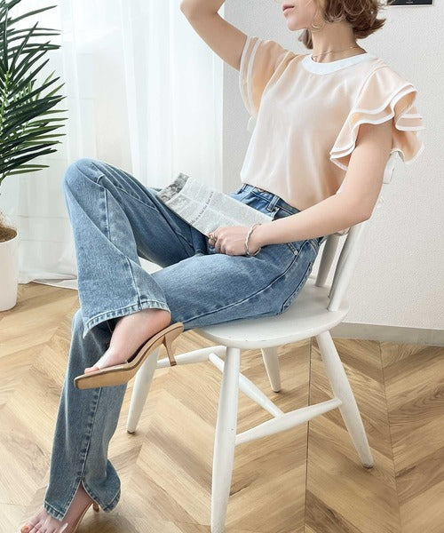 デニムパンツでフェミニン×カジュアルのミックスコーデもおすすめ。