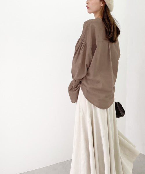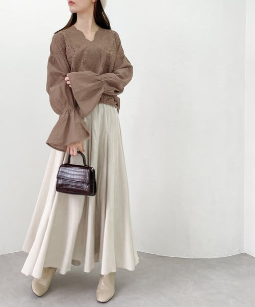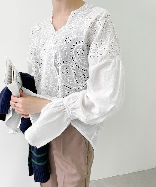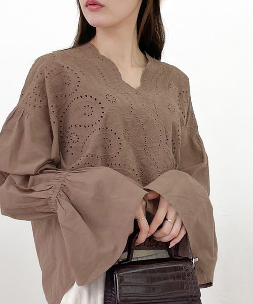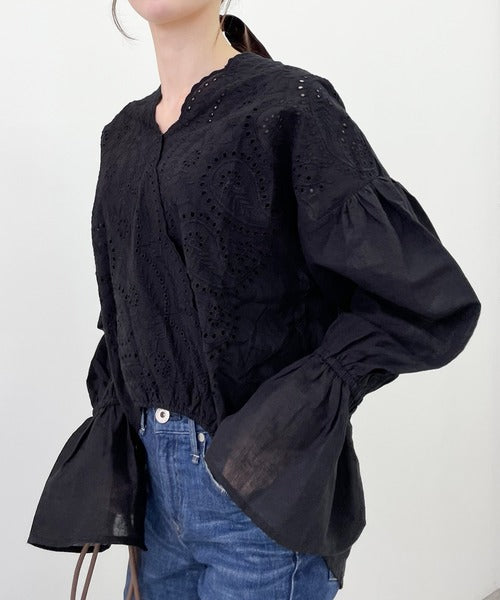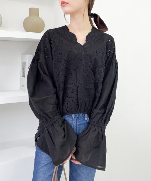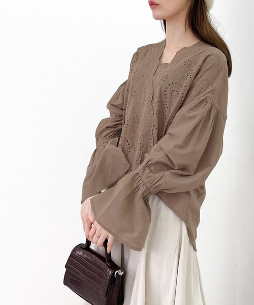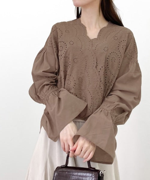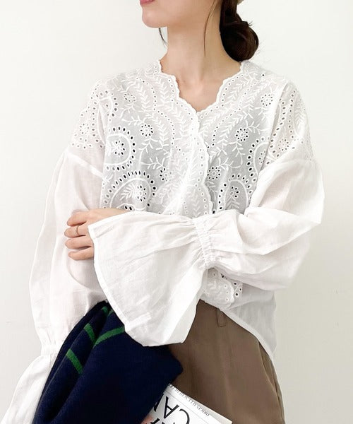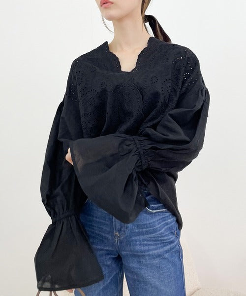上品なスカラップレースにボリューム感のあるふんわり袖のブラウス。