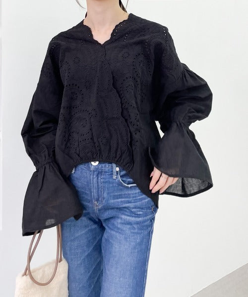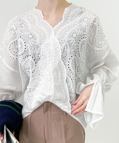 華やかなスカラップ刺繍レースブラウスは一枚で存在感抜群。