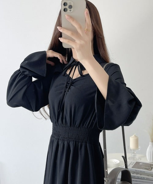 デコルテをキレイに見せてくれる程よい肌見せとリボンがガーリーさをプラスしてくれます。