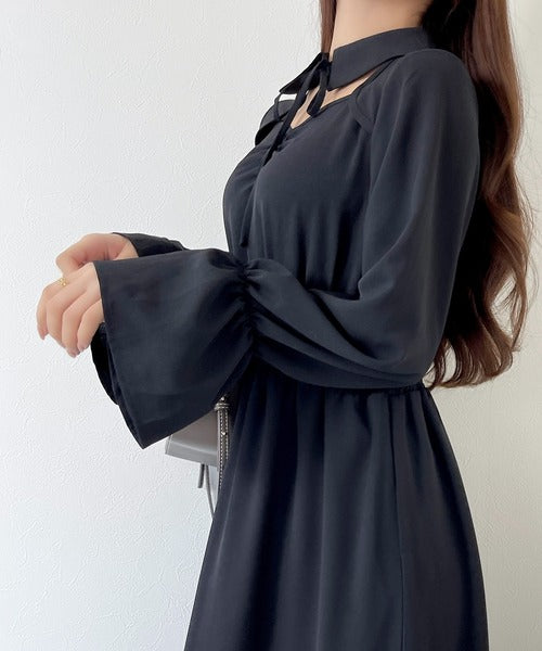 デコルテのリボンやマキシ丈のマーメイドシルエット、袖のフレアデザインなど