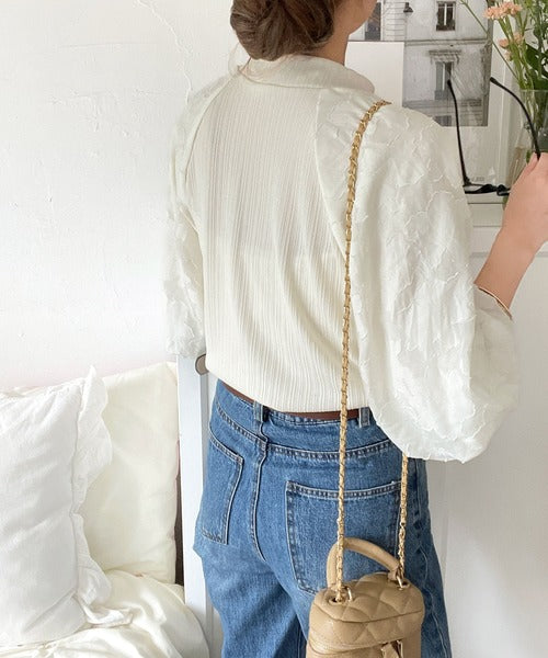 シンプルなボディにシアーなボリューム袖で盛夏まで着られるアイテム。