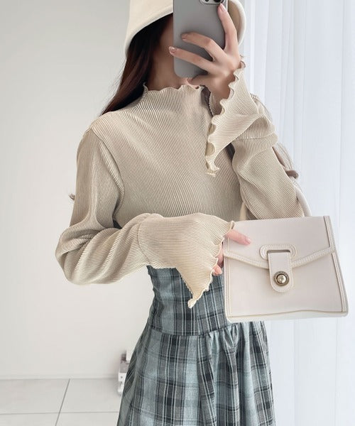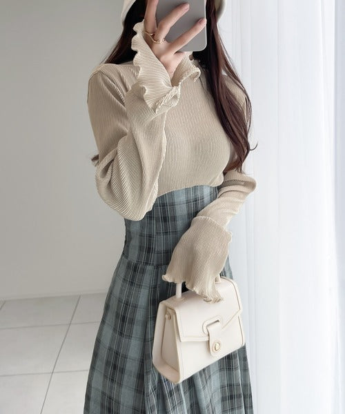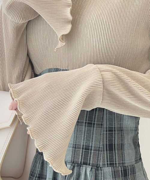 プリーツ加工のメロウカットソーはフレアスリーブデザインでさらに女性らしく仕上げました。