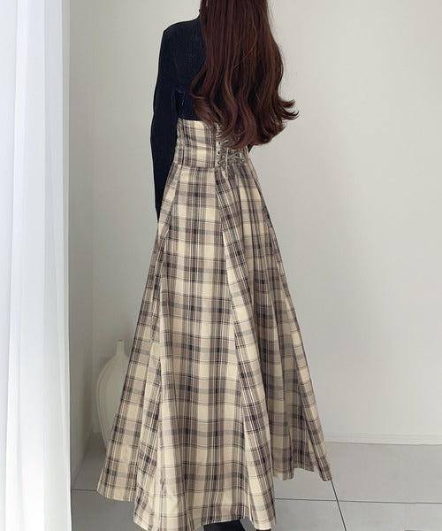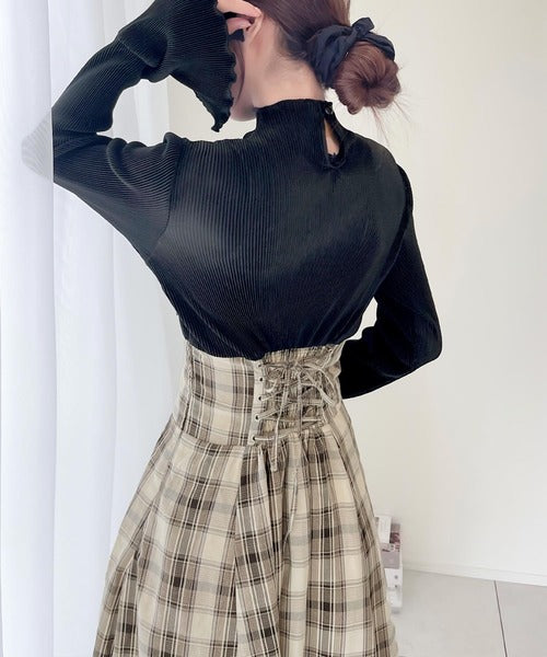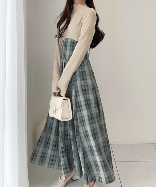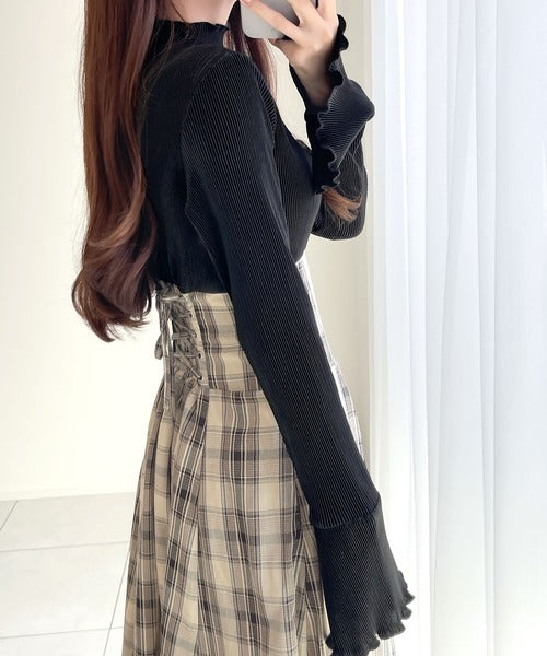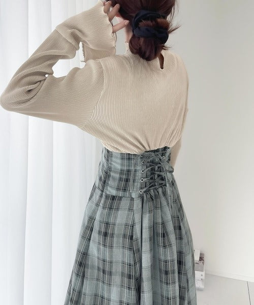 プリーツ加工のメローカットソーとチェックスカートのドッキングワンピ。