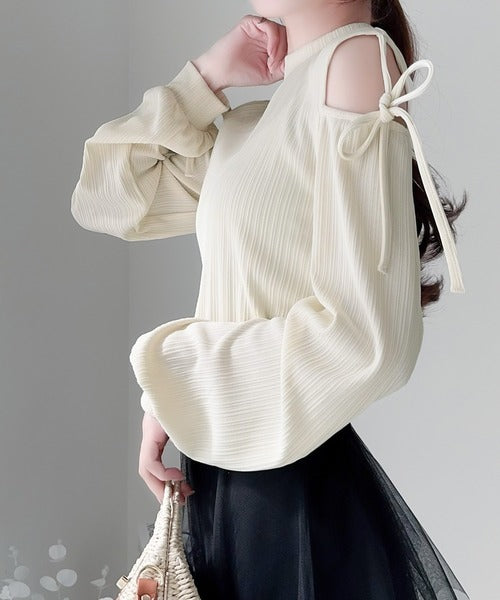 肩の肌見せで抜け感を演出し、肩リボンで女性らしいエッセンスをプラス。