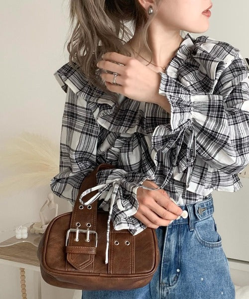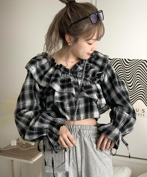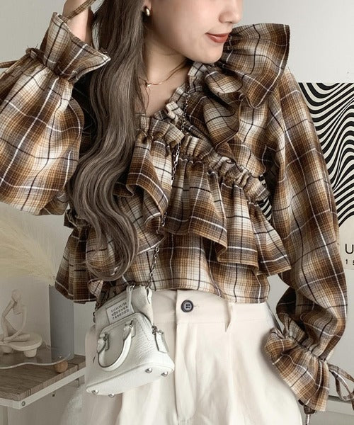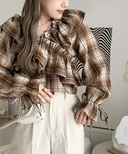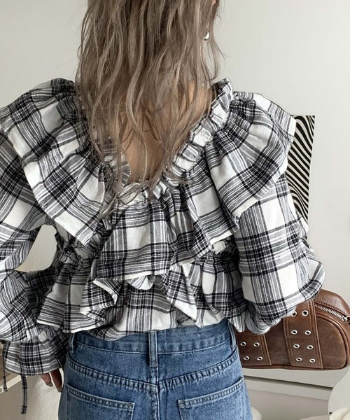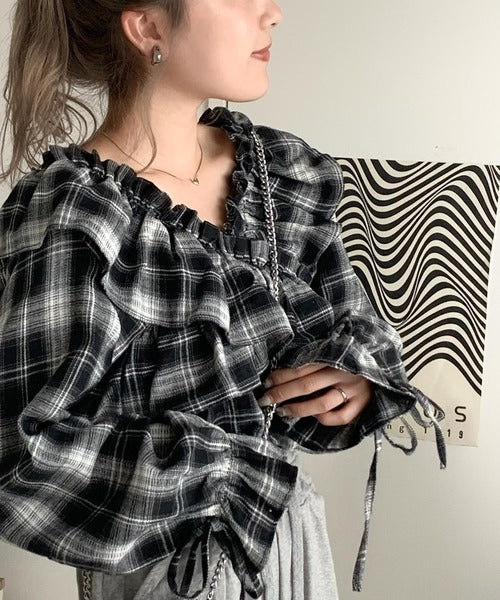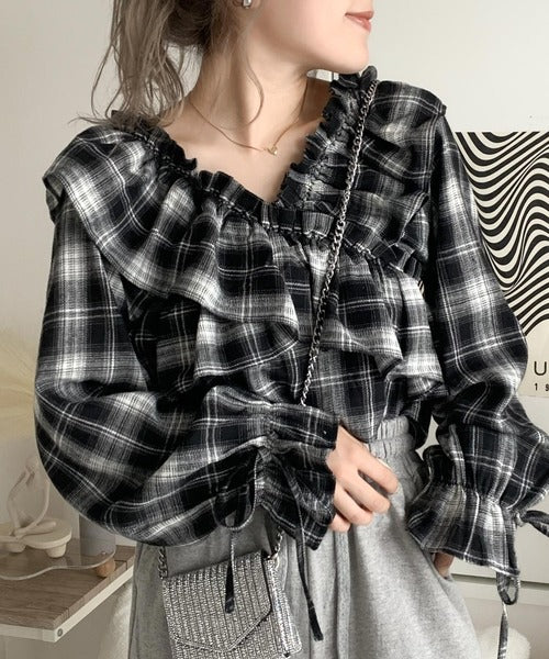 贅沢にギャザーを寄せたフリルをクロス状に配置したデザインブラウス。