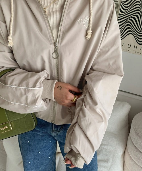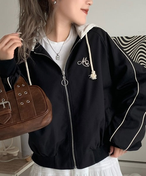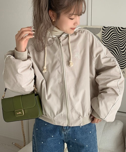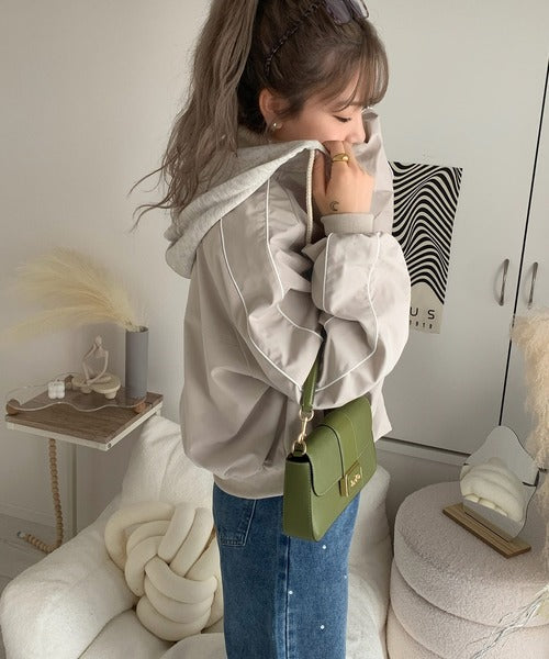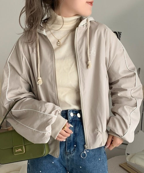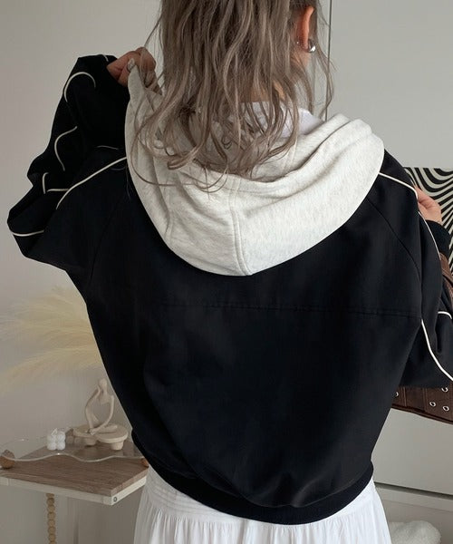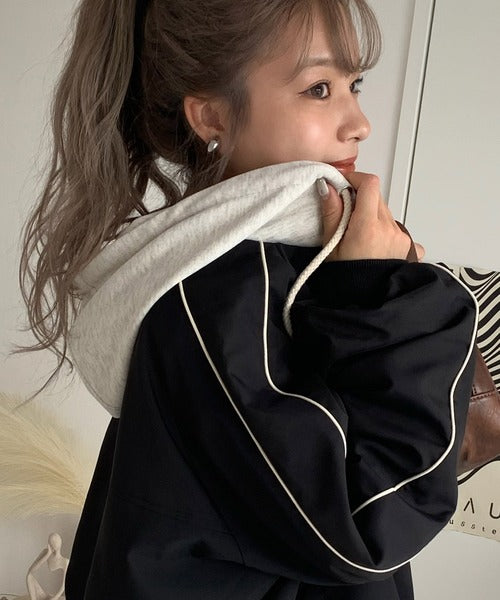 フード配色で可愛らしく袖にパイピングを入れて韓国テイストにしてます。