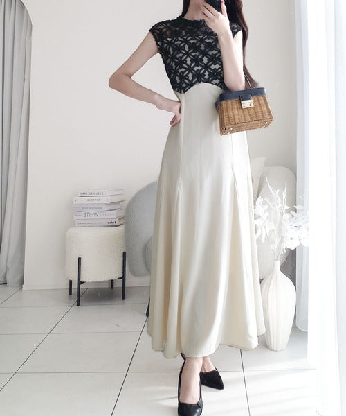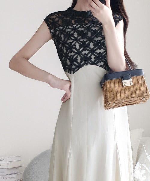 立体的な花モチーフのラッセル素材が目を引くワンピース。