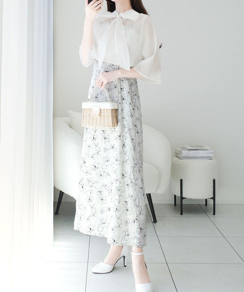 シアー感たっぷりの楊柳素材ブラウスを合わせたセット。