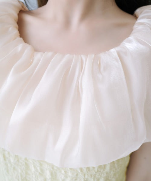 シアーシャイニー素材によるボリューム感あるビッグオーガンジー襟が、華やかさをプラス。