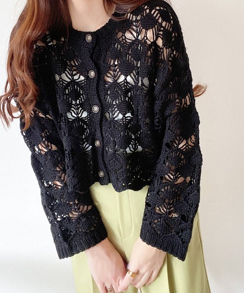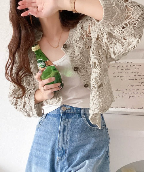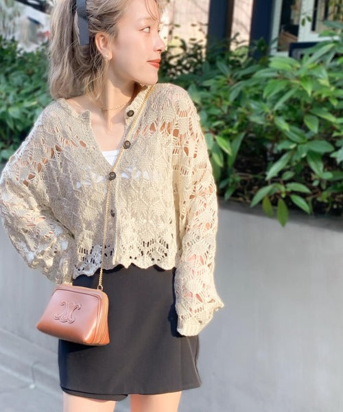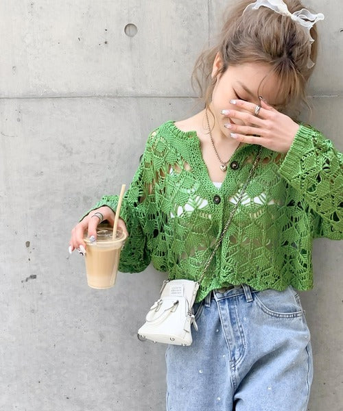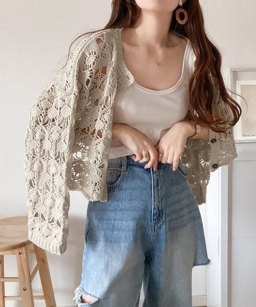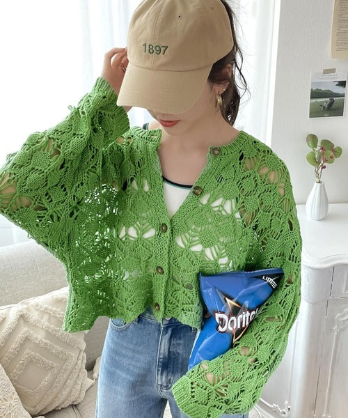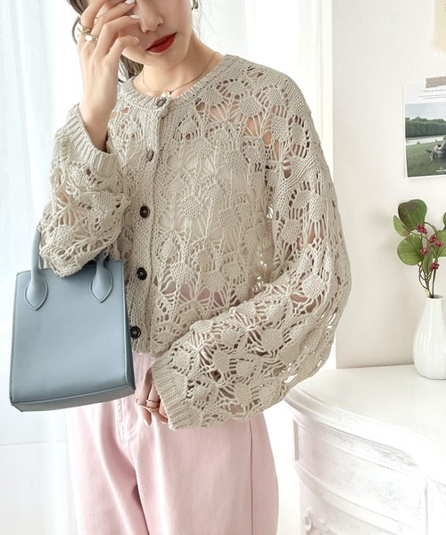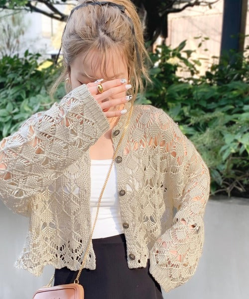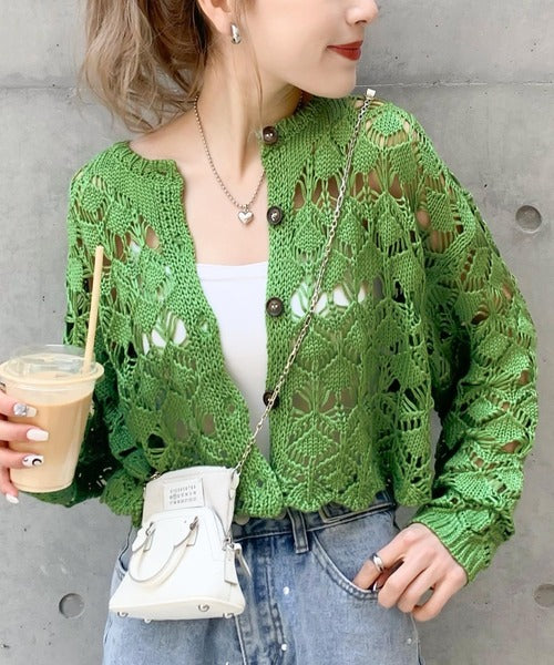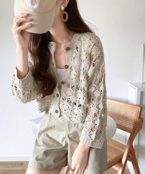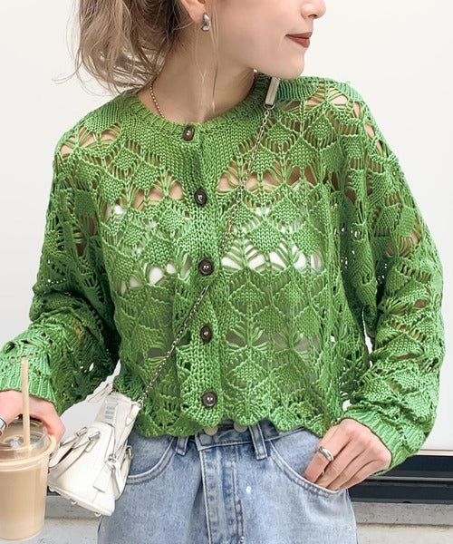 ヘルシーな肌見せ叶う、透かし編みが涼しげなニットカーデ。