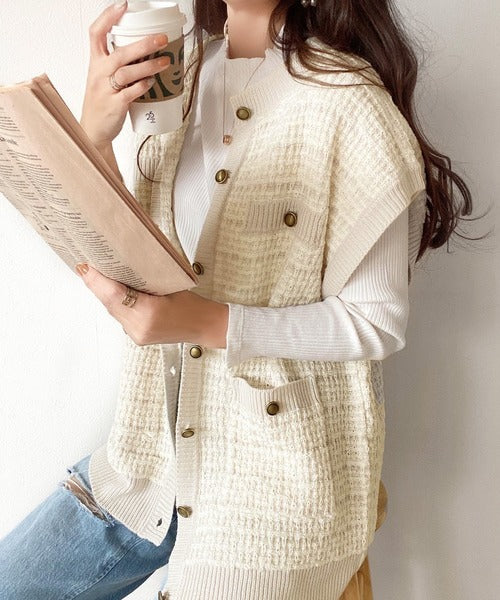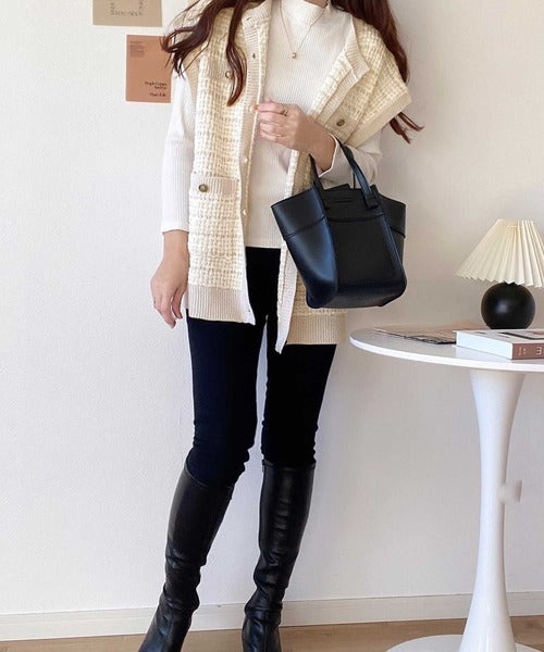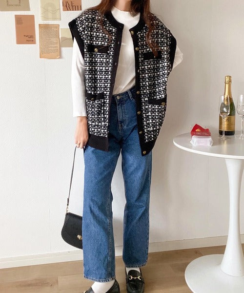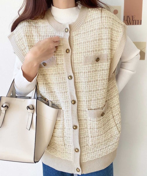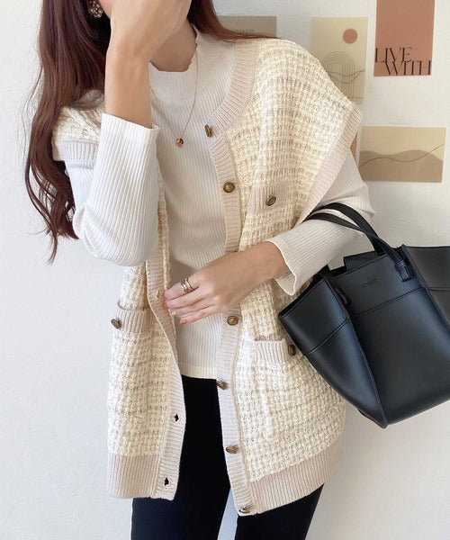 ツイード風ニットジレを羽織るだけで、カジュアルコーデの洗練度UP!