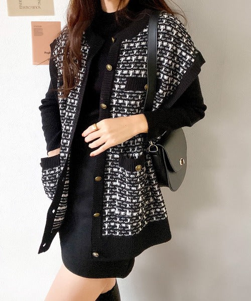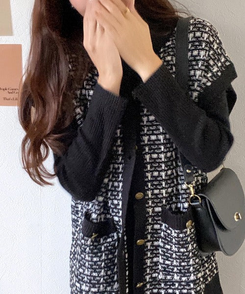 旬のレイヤードスタイルを楽しめるツイードオーバーニットは