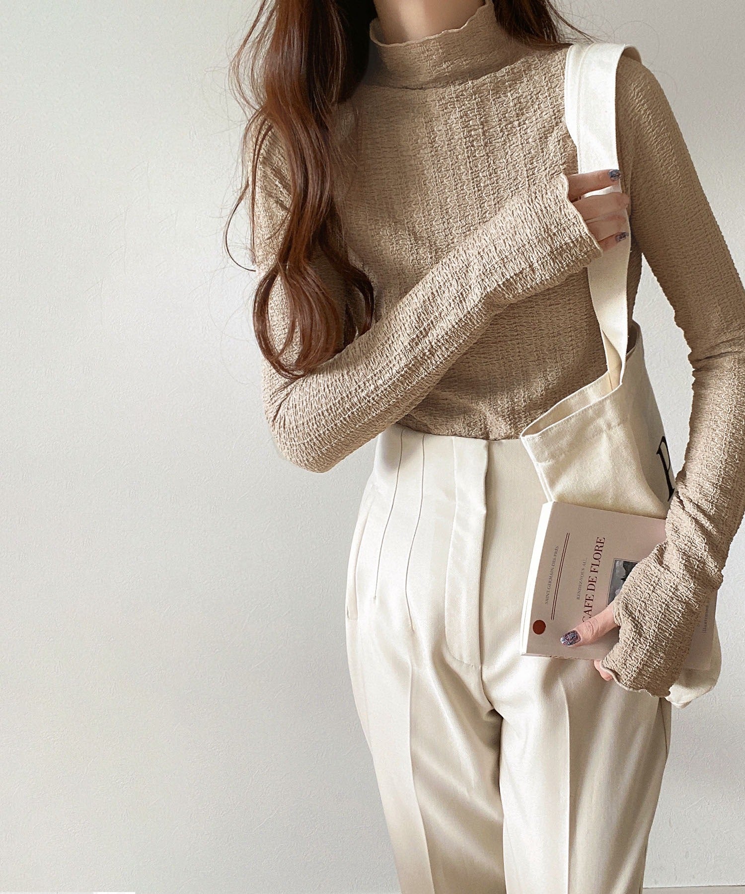 大人ハイネックのこなれたシルエットと華奢見えする素材感で