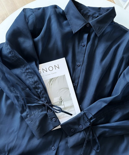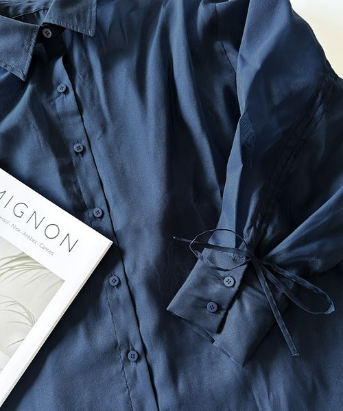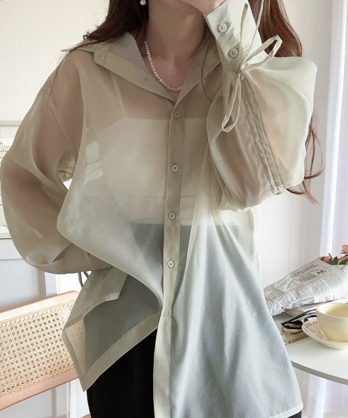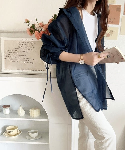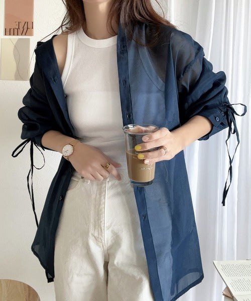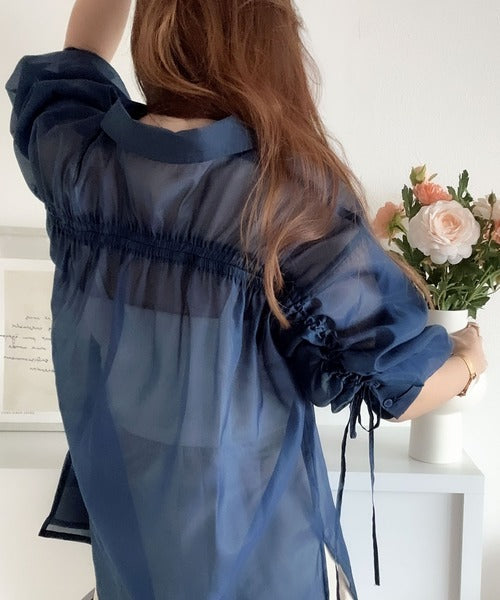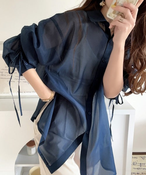 今年流行のディティールのドロストが特徴のシアーシャツ。