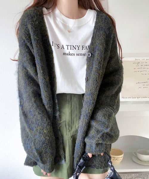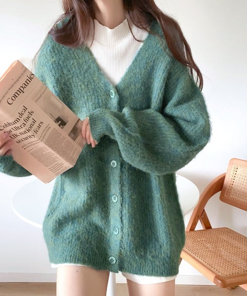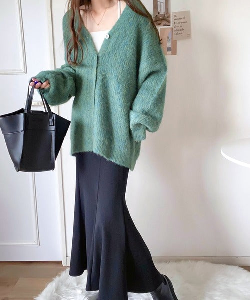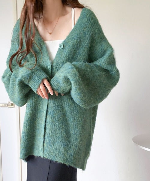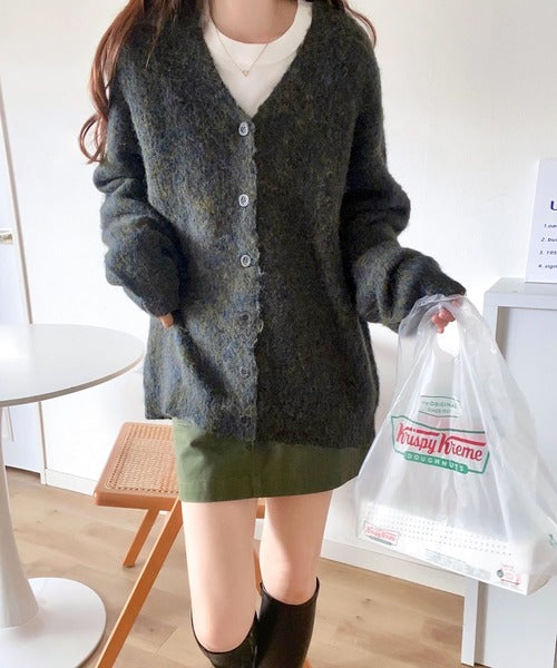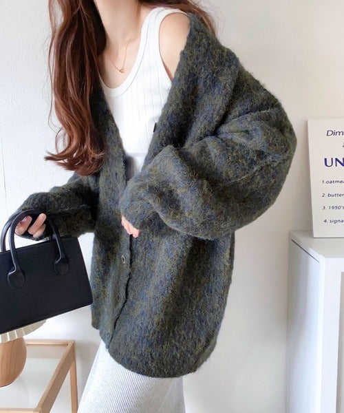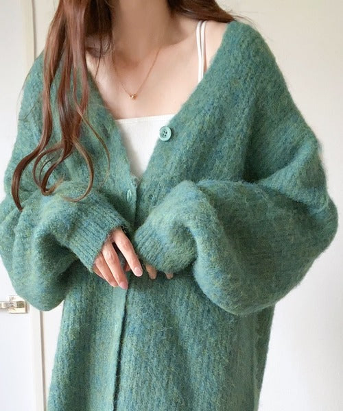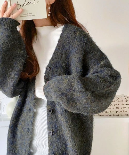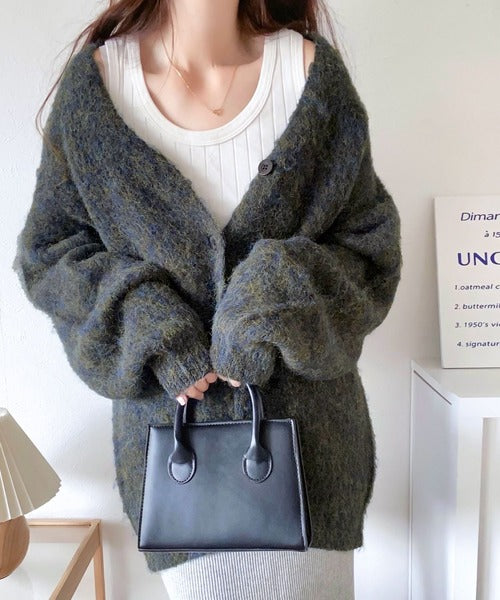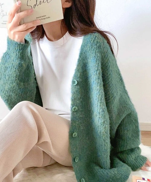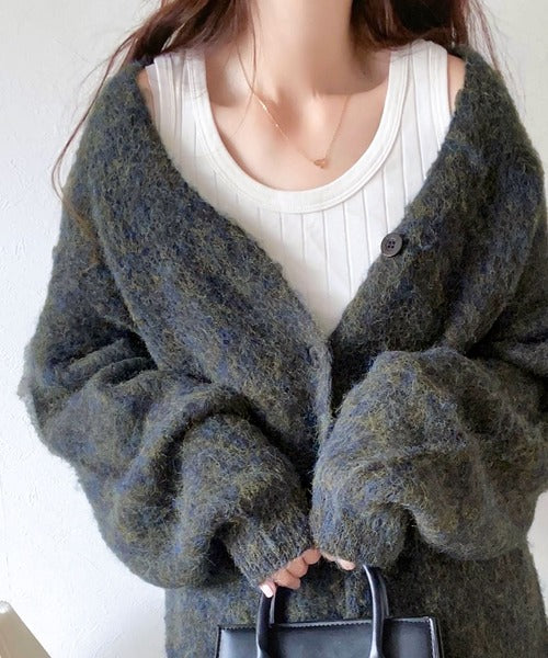 ヒップが隠れる丈のざっくり感が魅力のカーディガン。