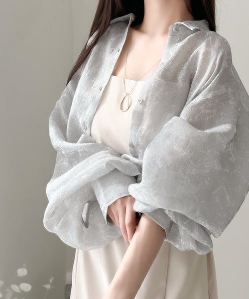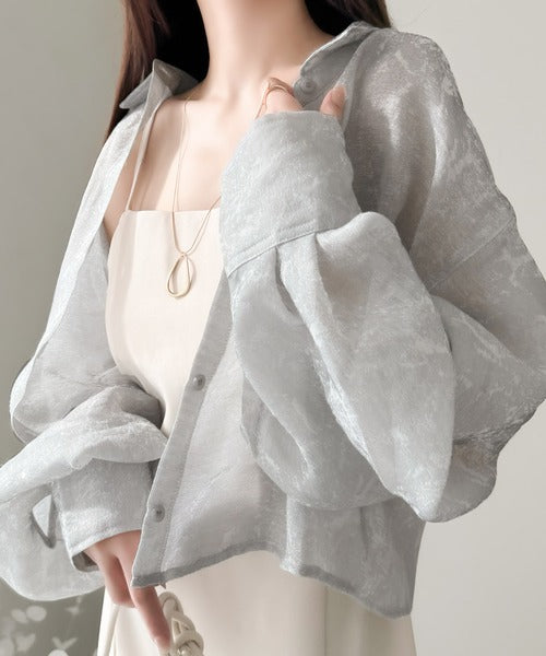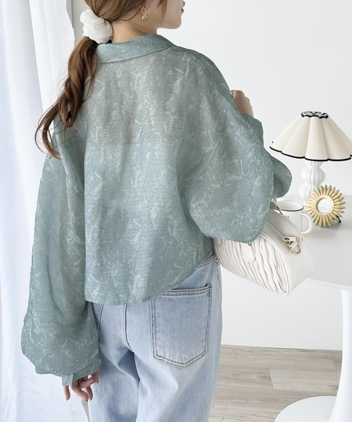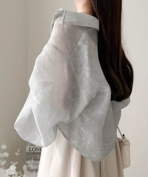 透け感のある柔らかいシアー素材に、ふんわりとしたボリュームスリーブがマニッシュになりすぎず上品な印象に。