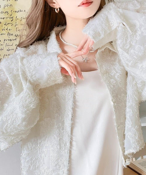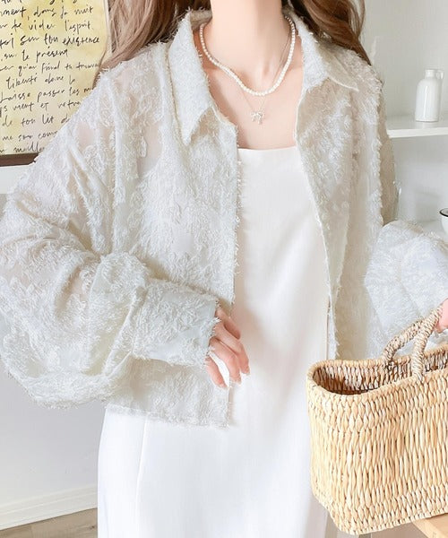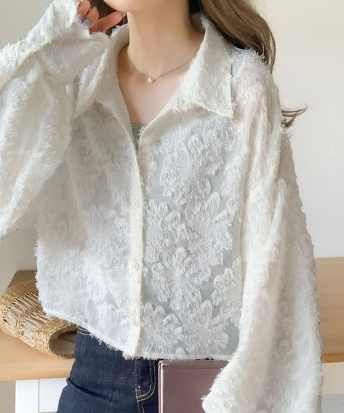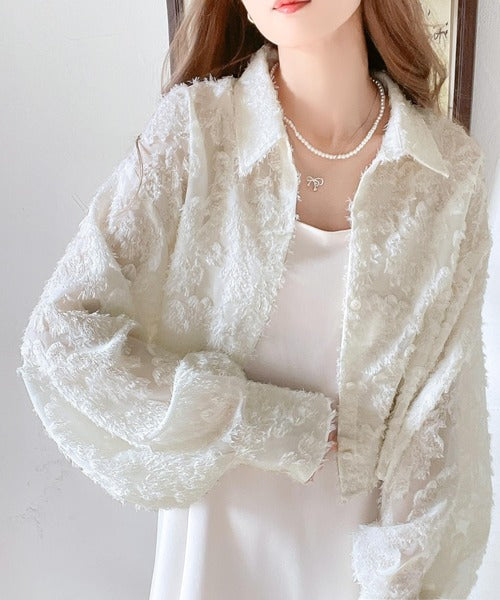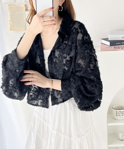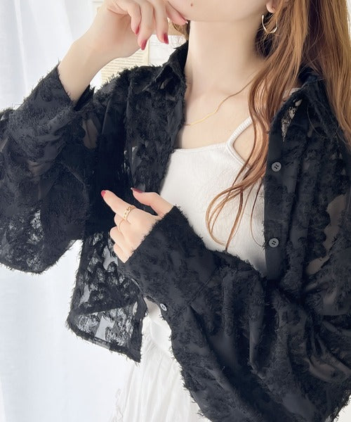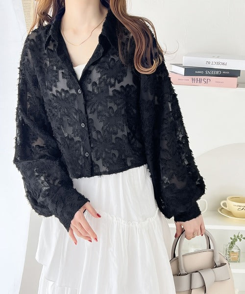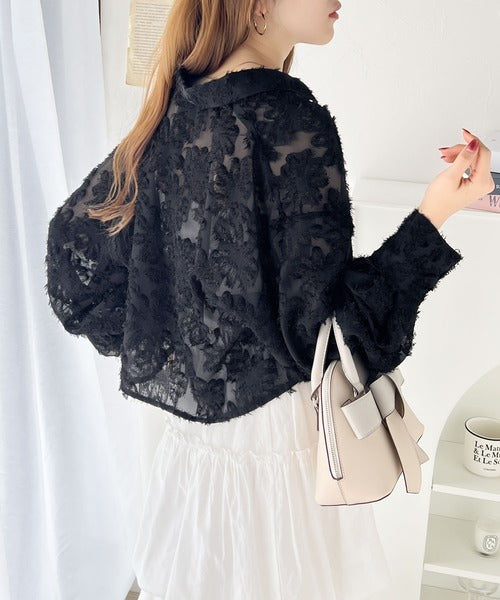 花柄フリンジジャガード素材が特徴的なクロップド丈シャツ。
