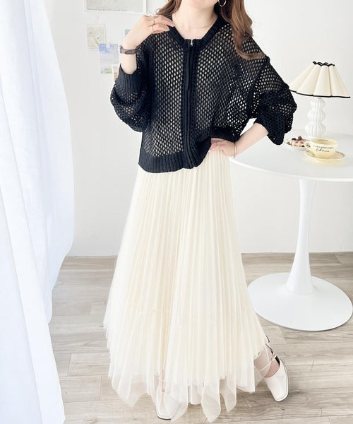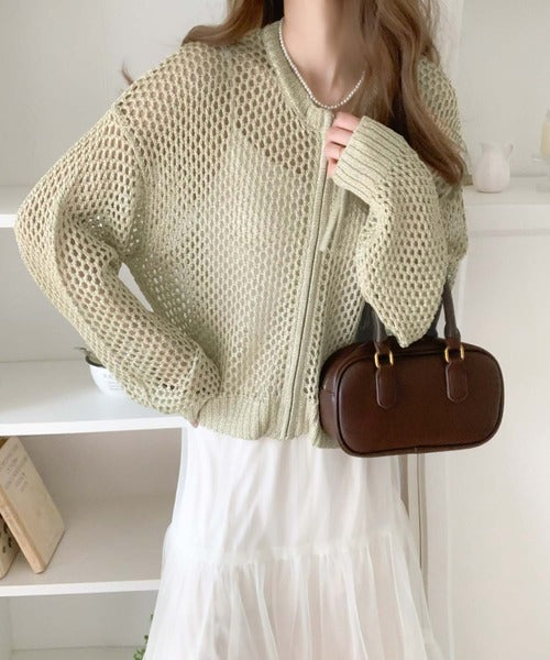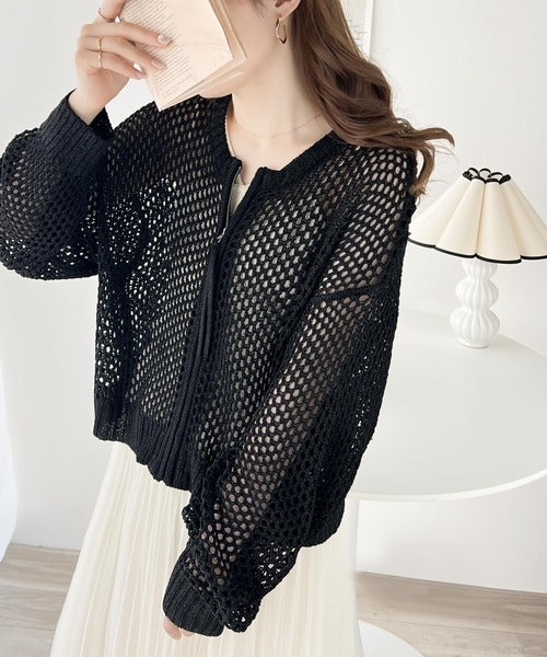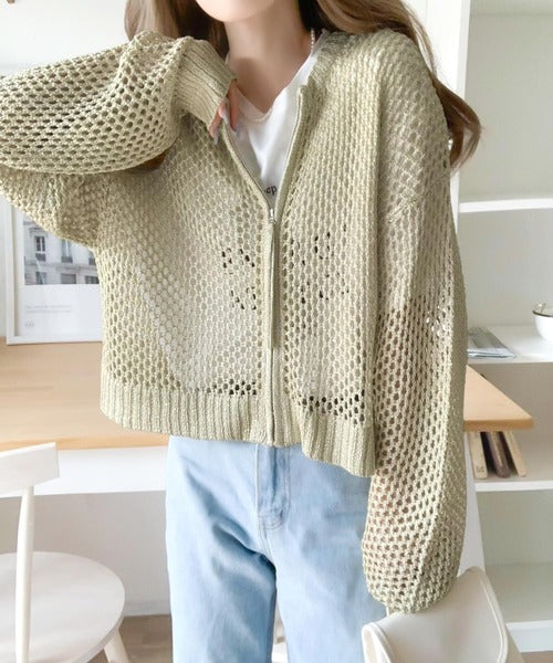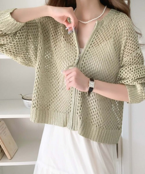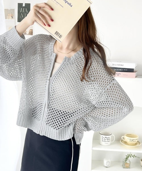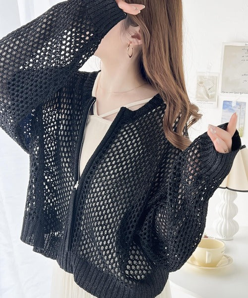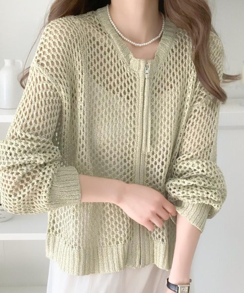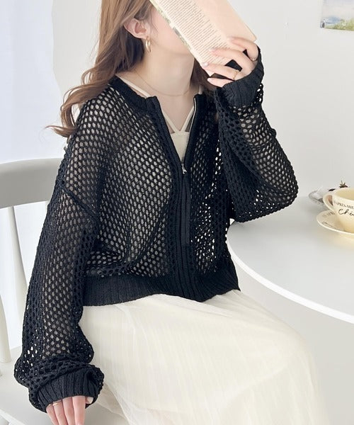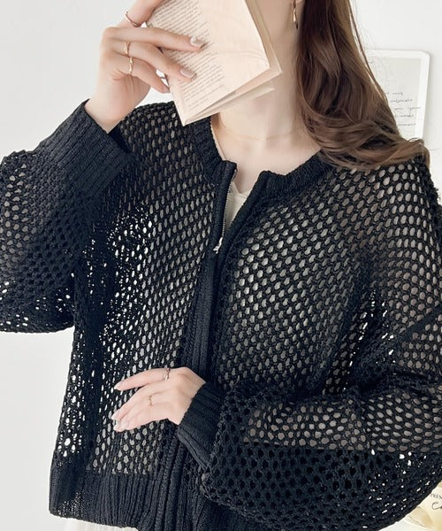 抜け感たっぷりなメッシュ編みですっきりとした着用感のジップカーディガン。