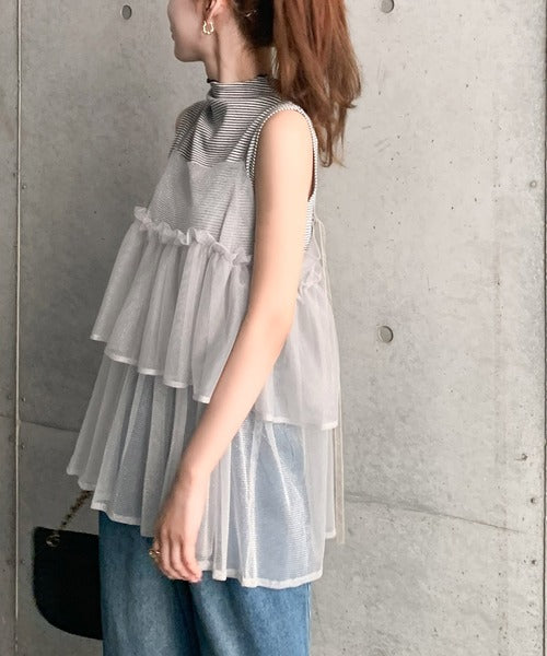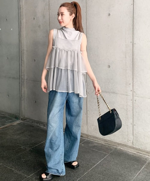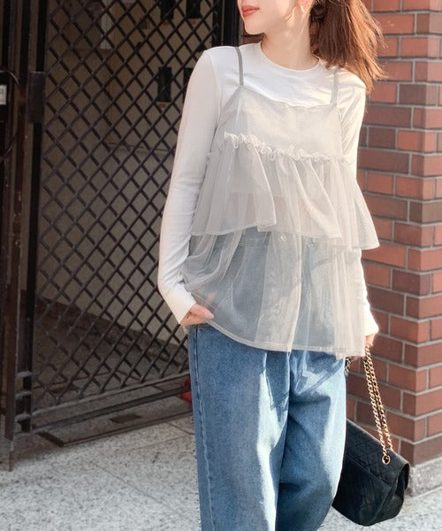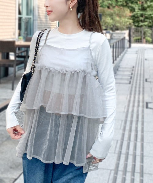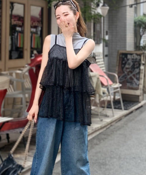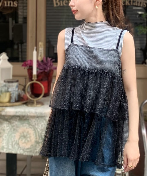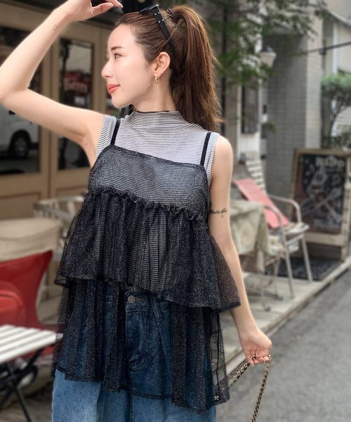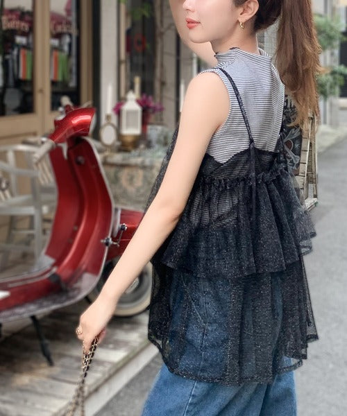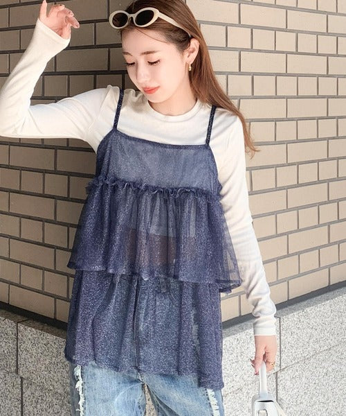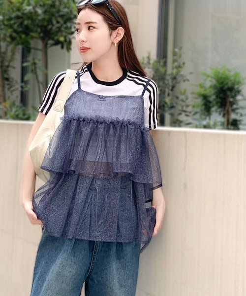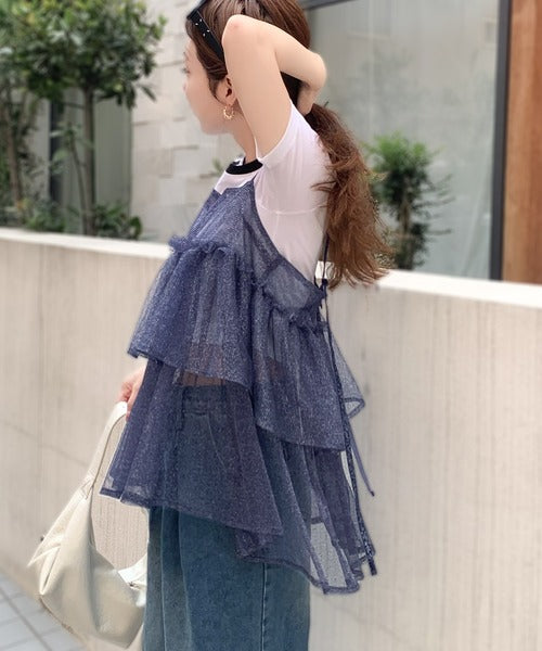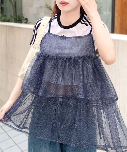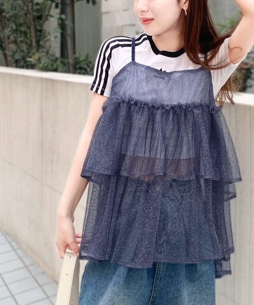ラメチュールを重ねたティアードフリルが華やかなキャミソール。