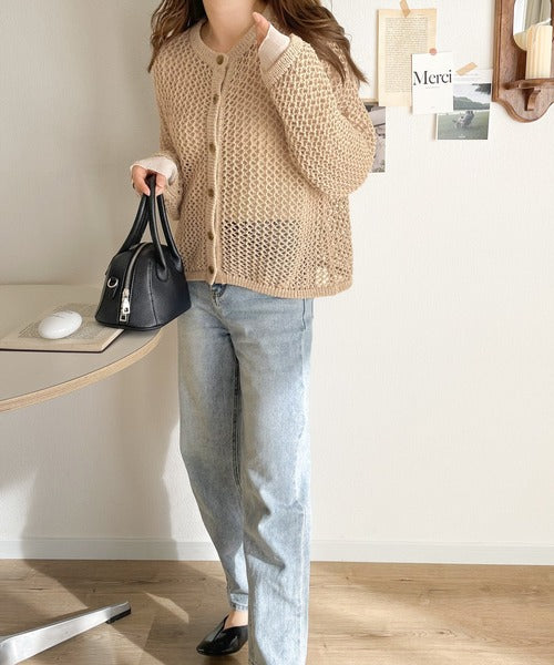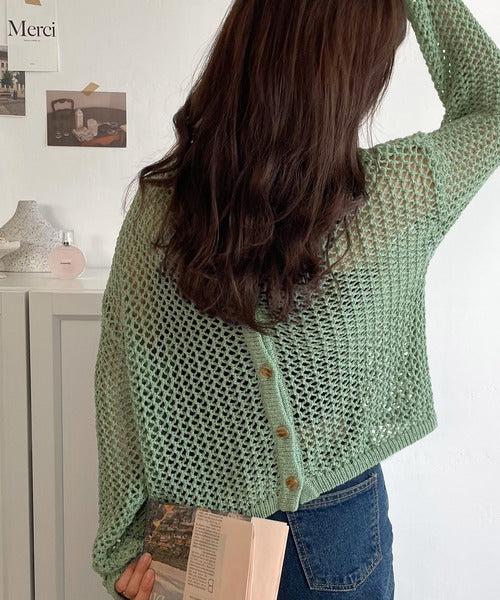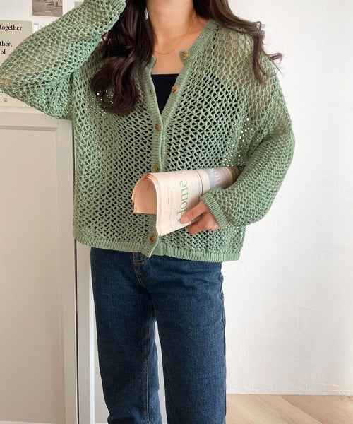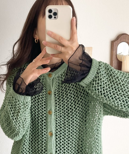 レイヤードを楽しむためのメッシュニットカーディガンです。