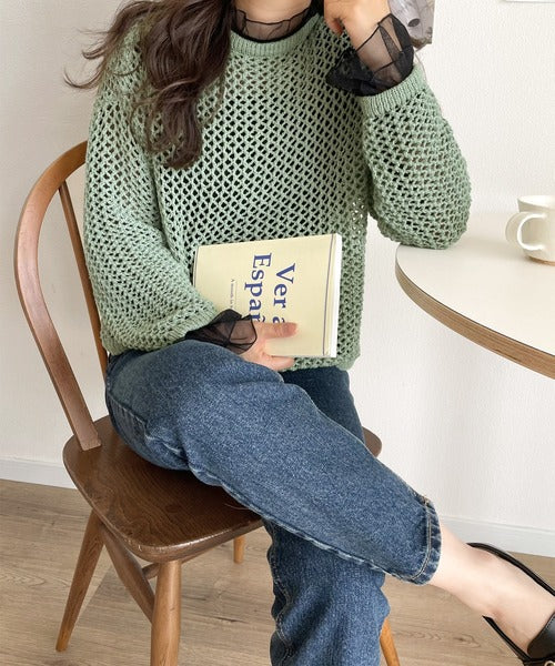 トレンドのレイヤードスタイルを楽しめる透かし編みニットトップスです。