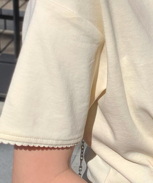 衿と袖口のレースが甘すぎないアクセントになり、さまざまなスタイリングで活躍するアイテムです。