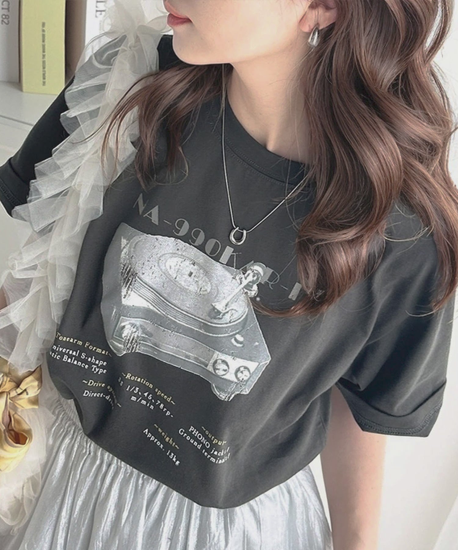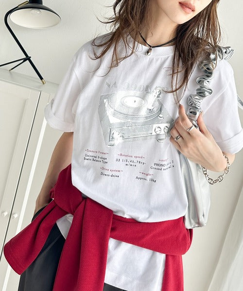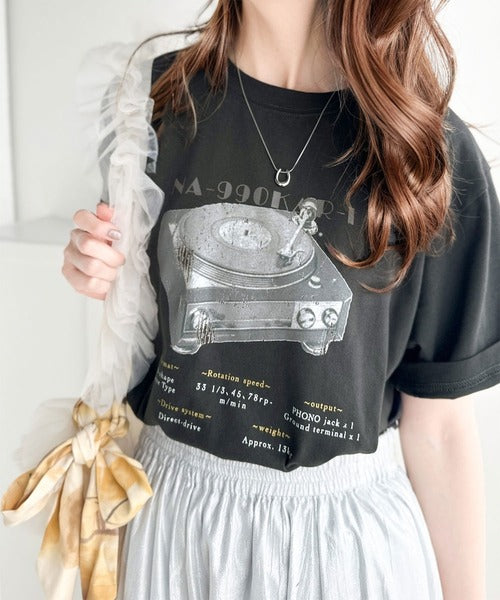 レコードプレイヤーのデザインがプリントされたグラフィックTシャツは、