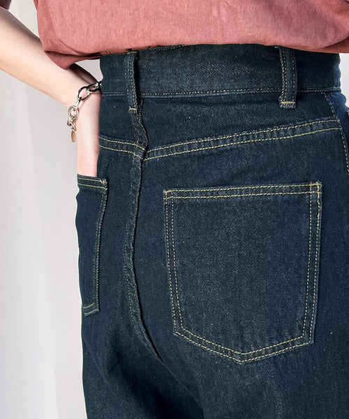 ハイウエストデニムなので、トップスインやショート丈トップスでよりスタイルアップ効果を発揮。