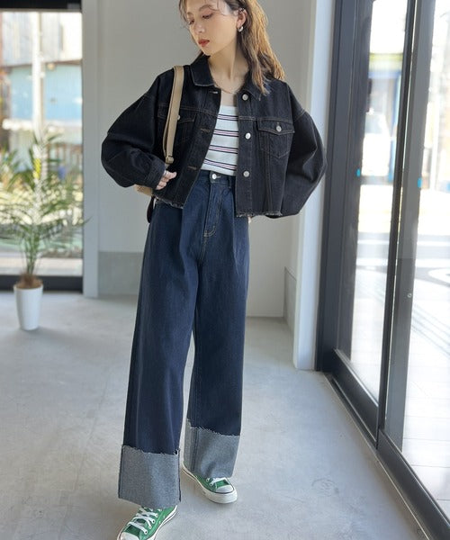 ショート丈なので流行りのスウェットやワイドデニムパンツなど