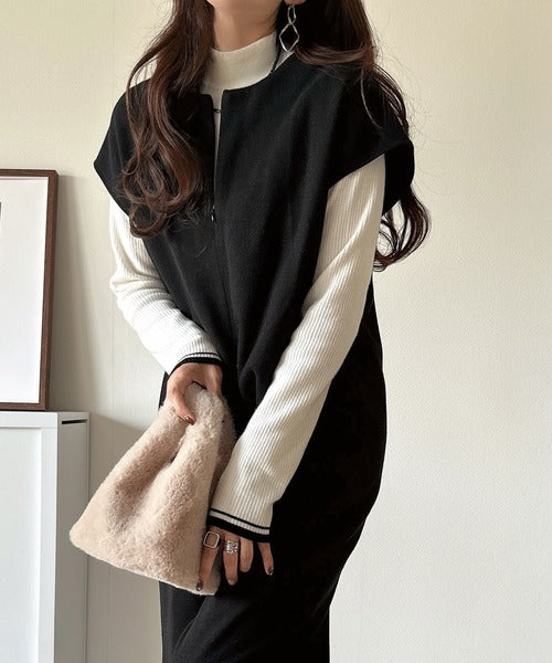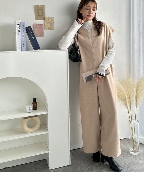 秋冬の必須アイテム、フェイクウール素材のハーフジップオールインワン。