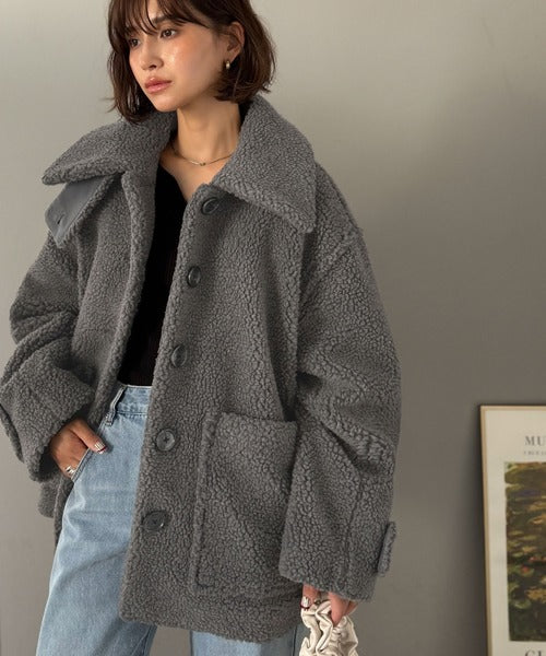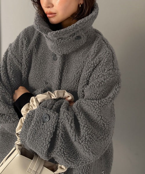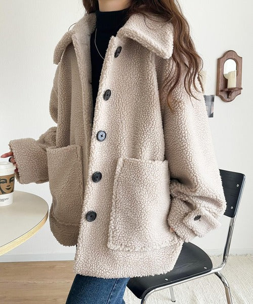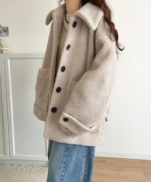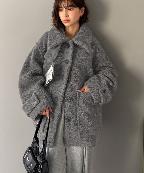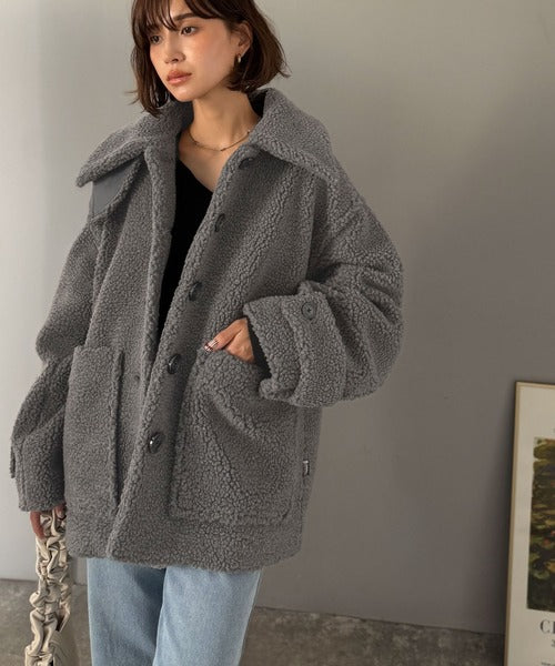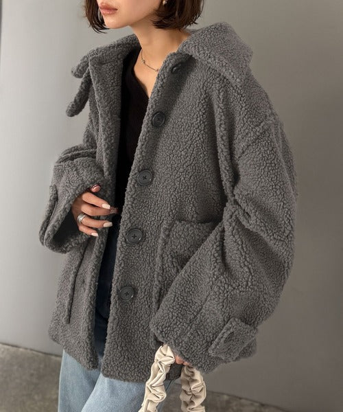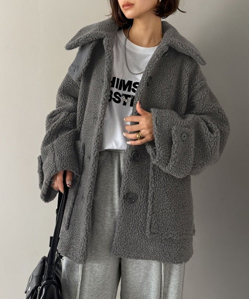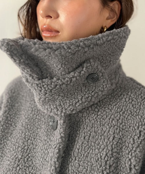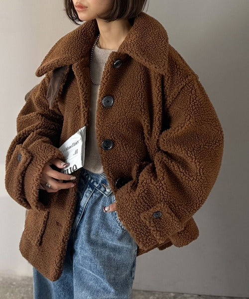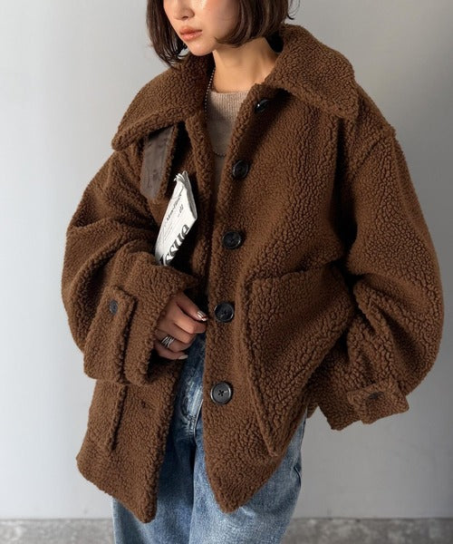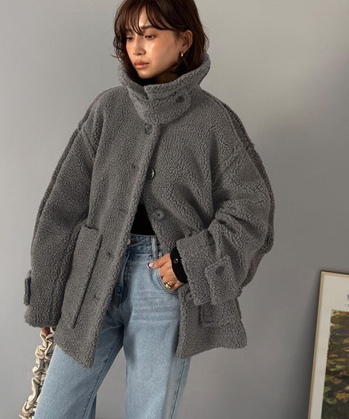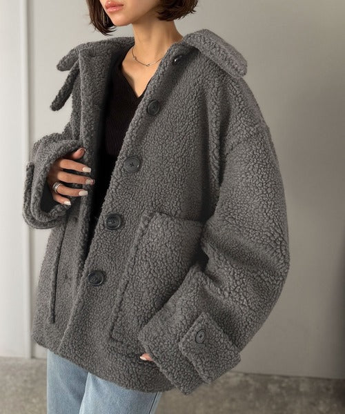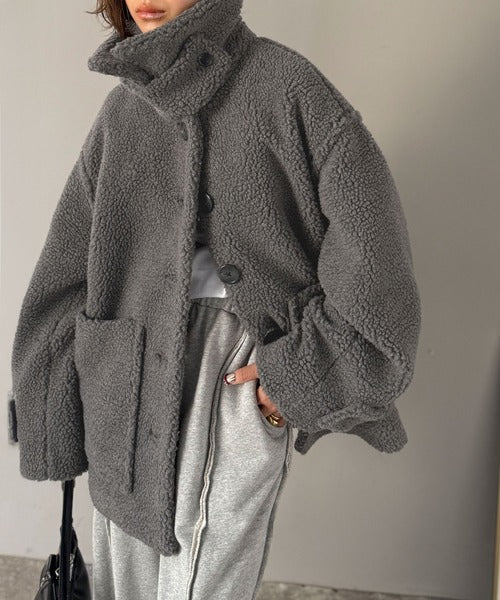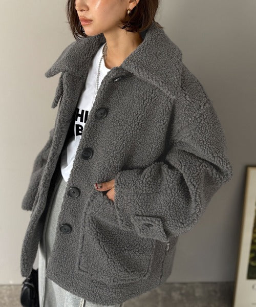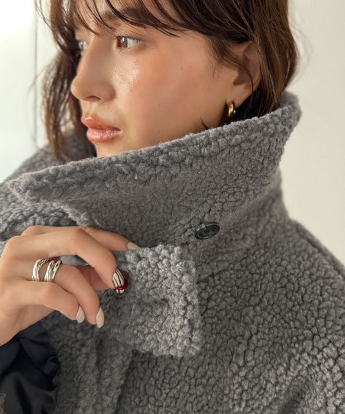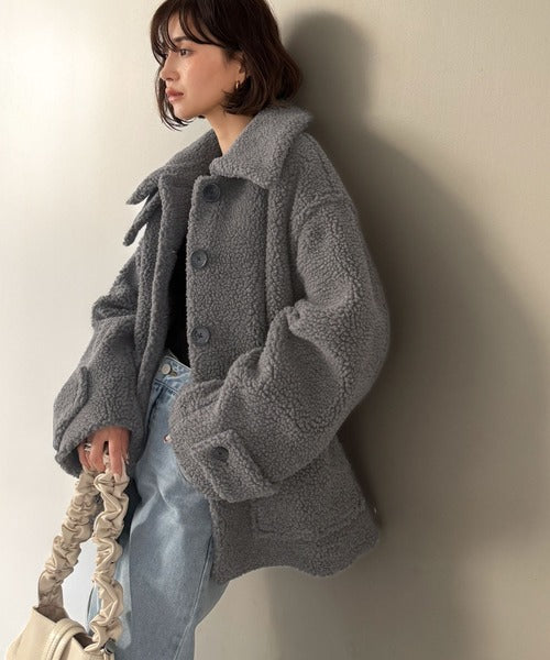 厚手の大粒ボアを使用した、大きめポケットつきショートブルゾン。