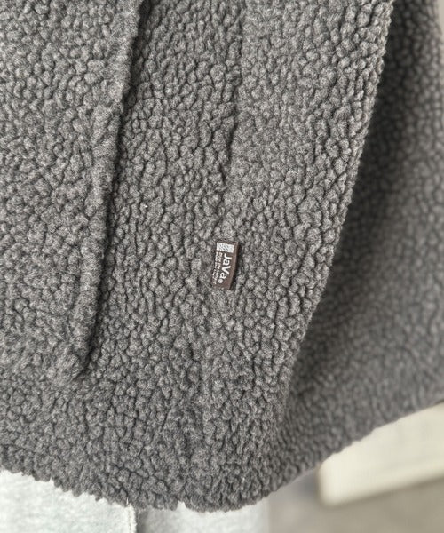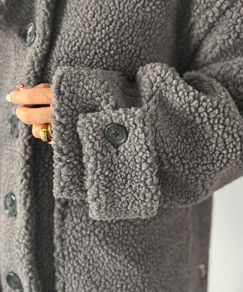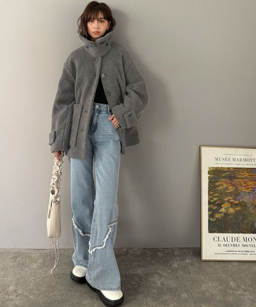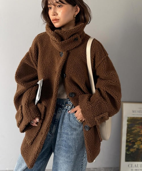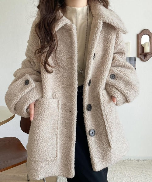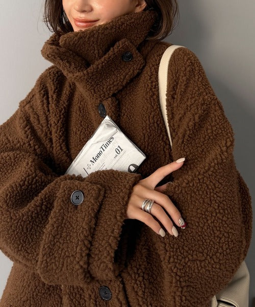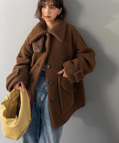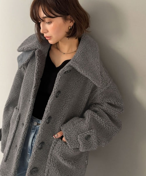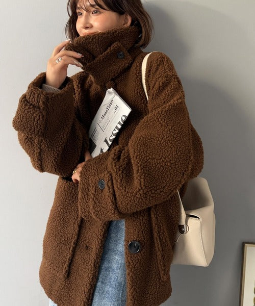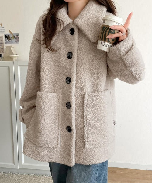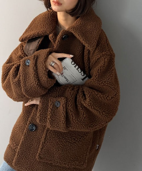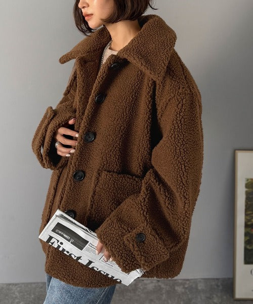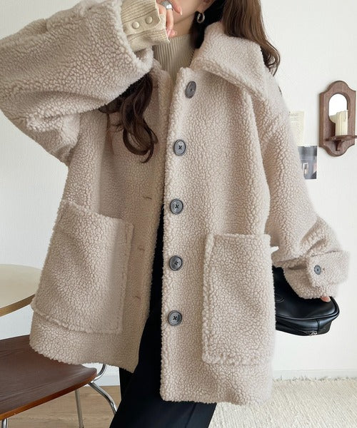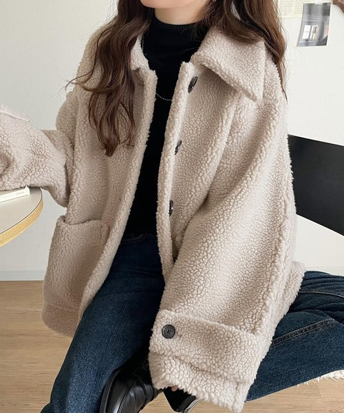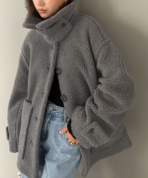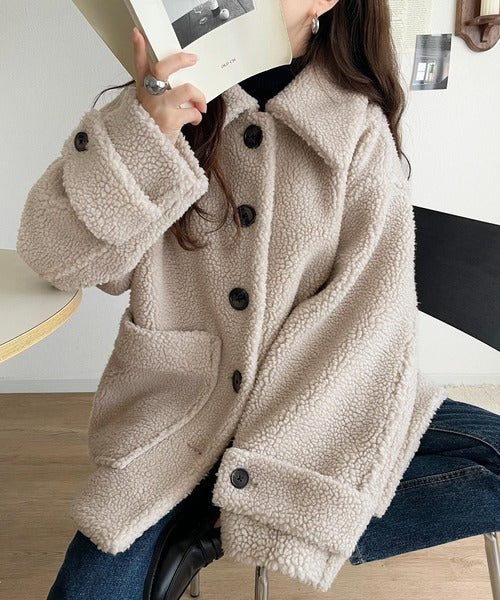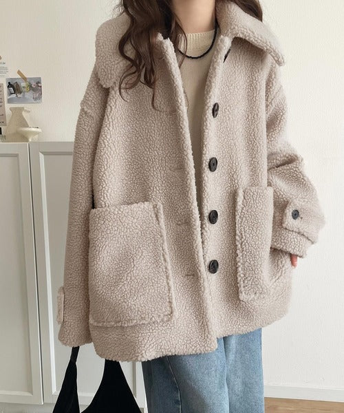 厚手の大粒ボアを使用した、大きめポケットつきショートブルゾン。