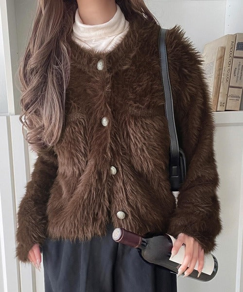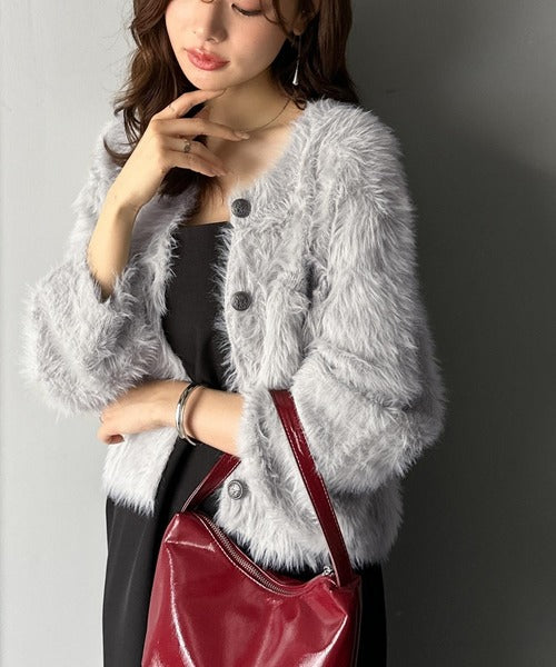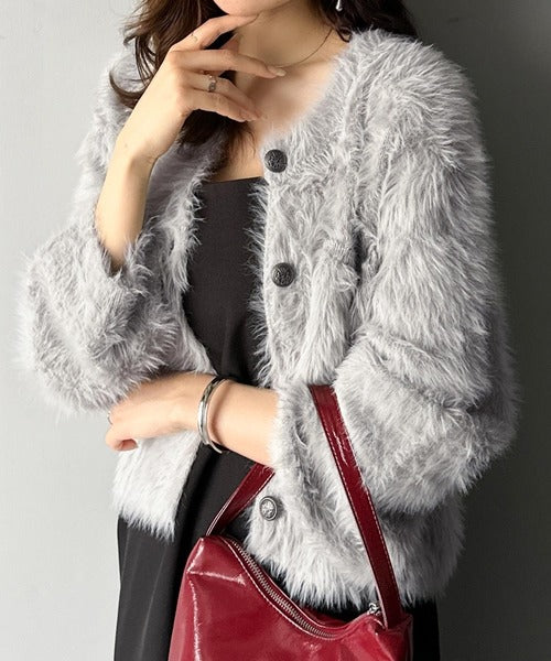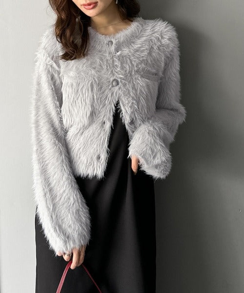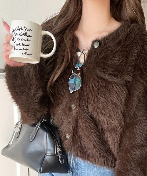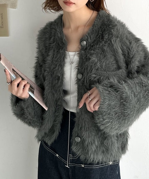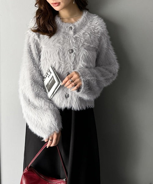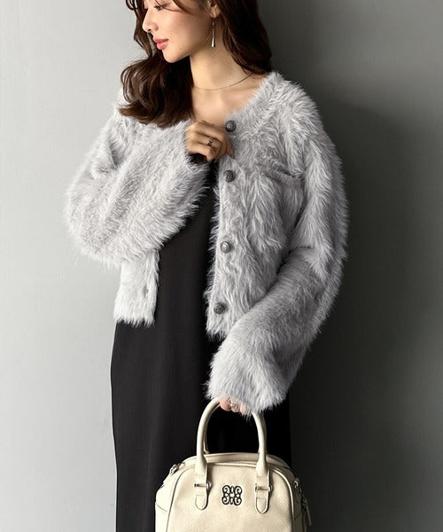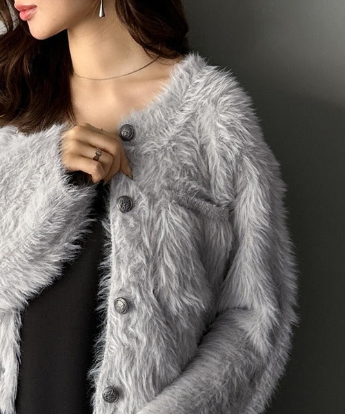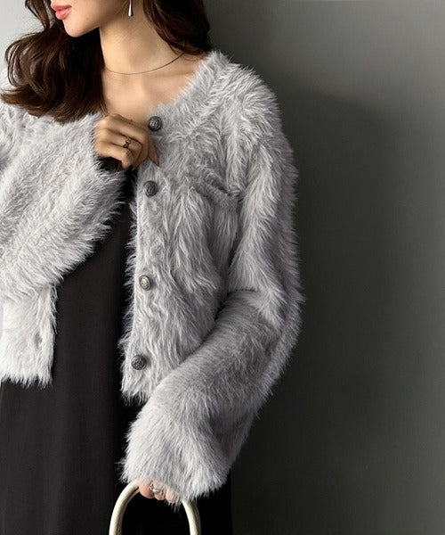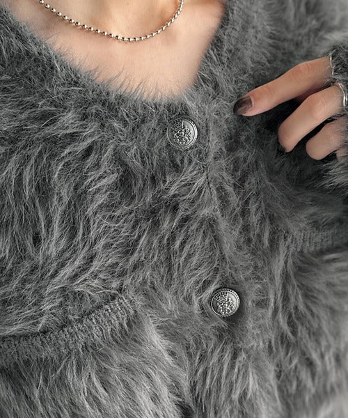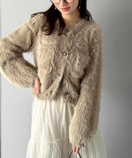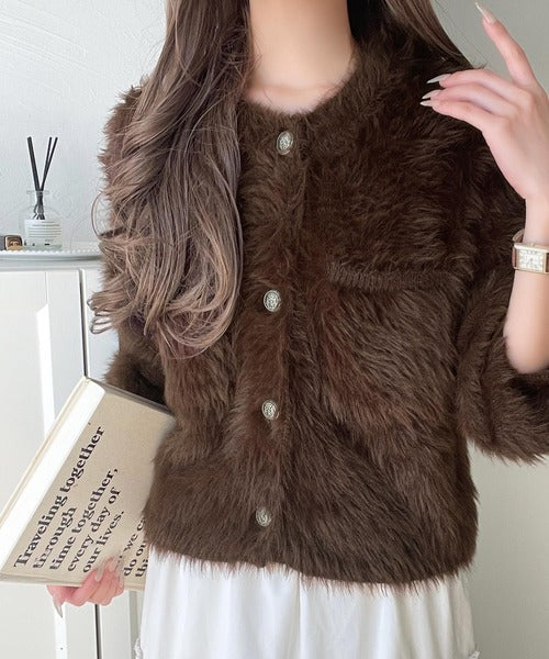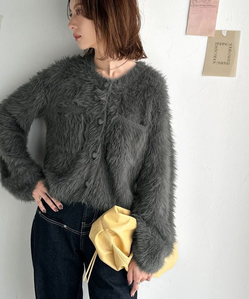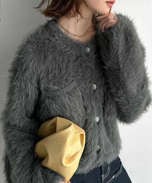 毛足の長いシャギーニットをたっぷり使用したクルーネックカーディガン。