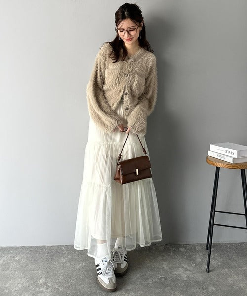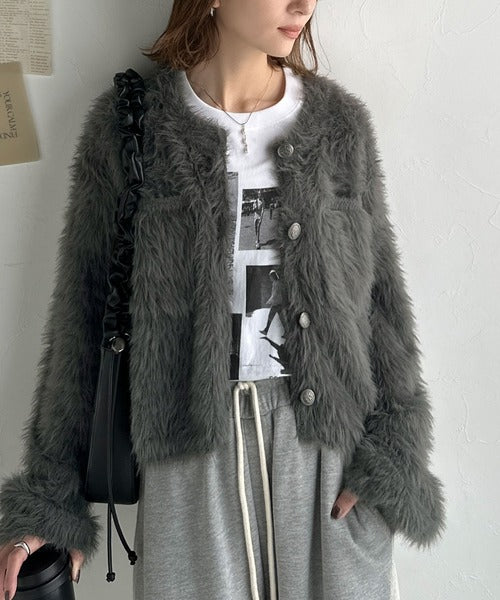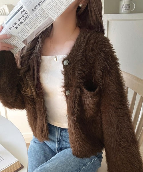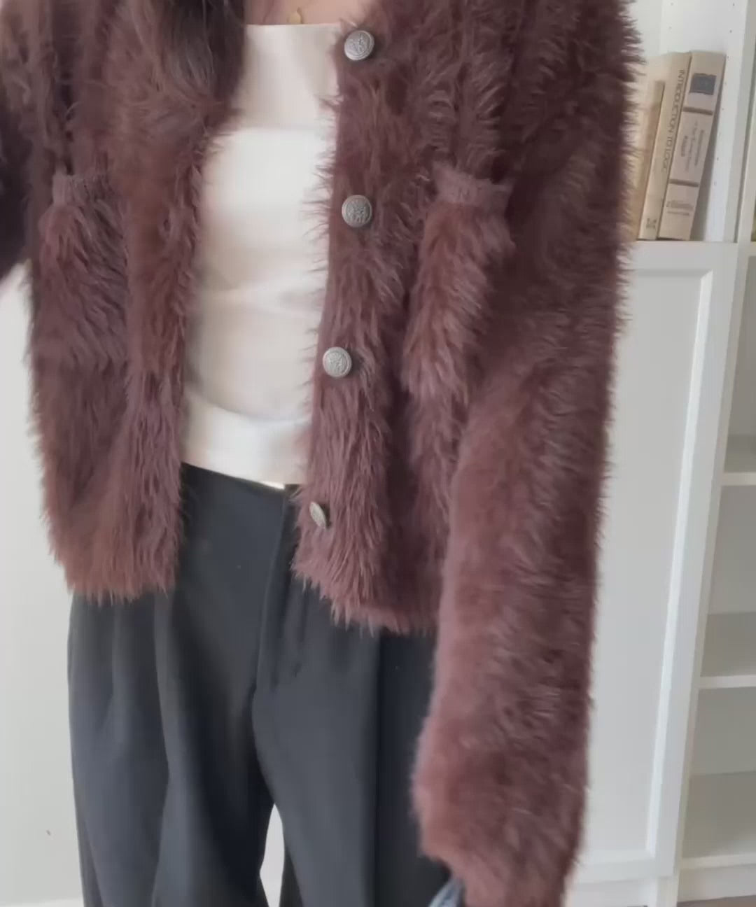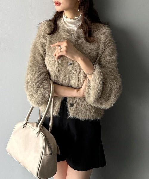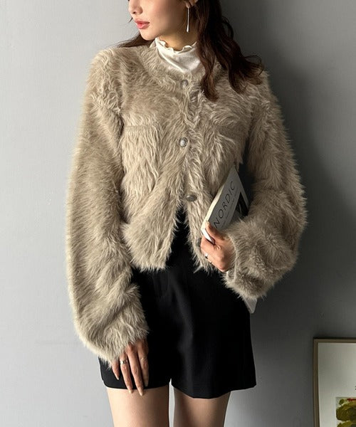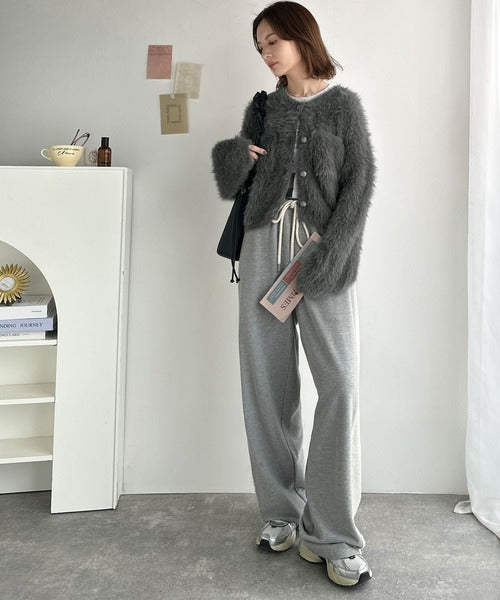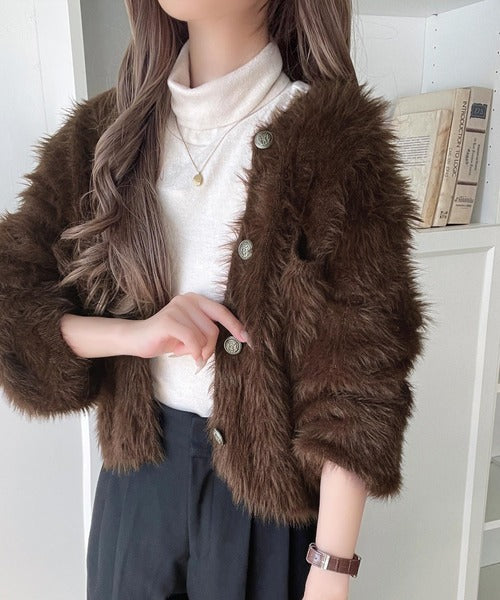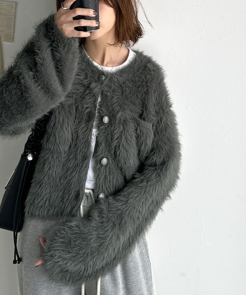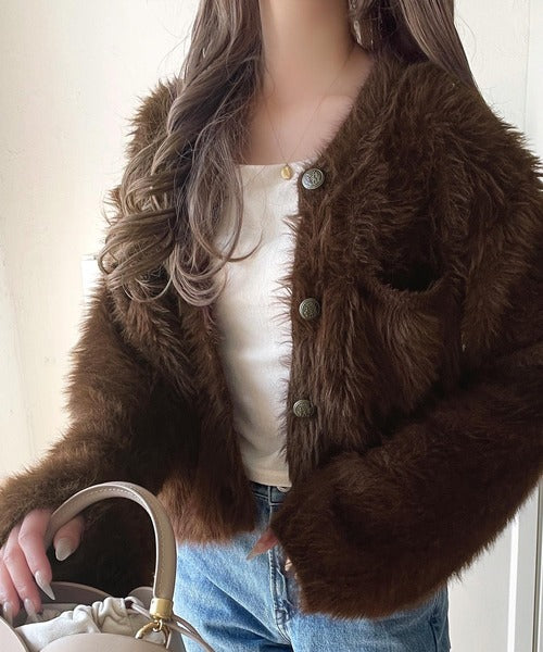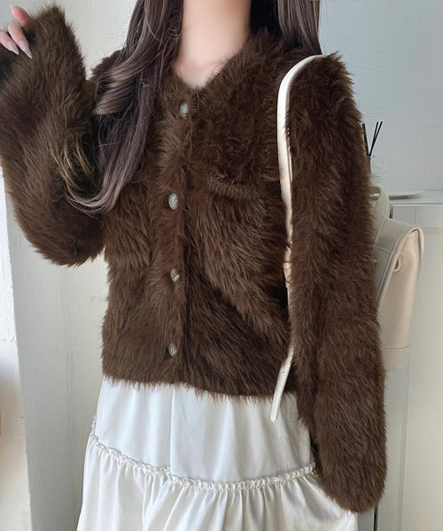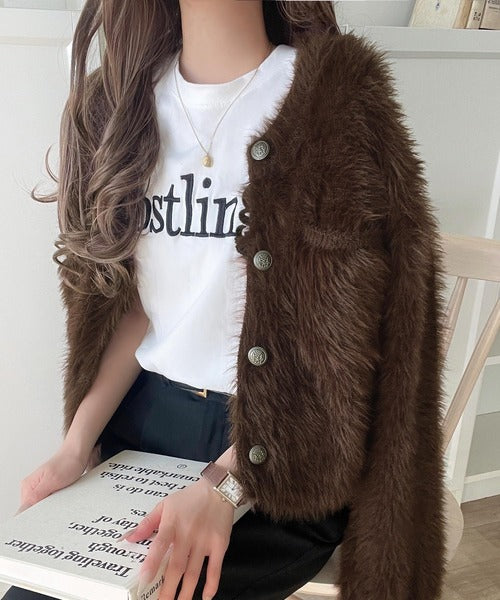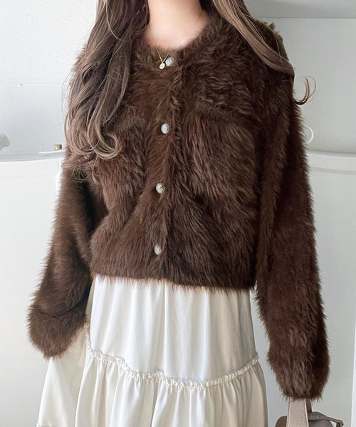 毛足の長いシャギーニットをたっぷり使用したクルーネックカーディガン。