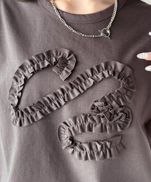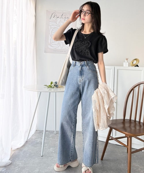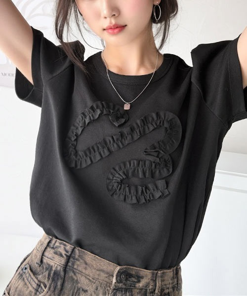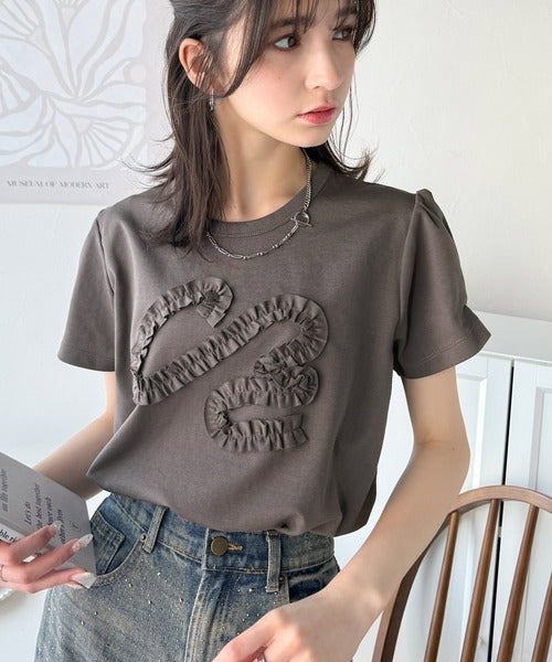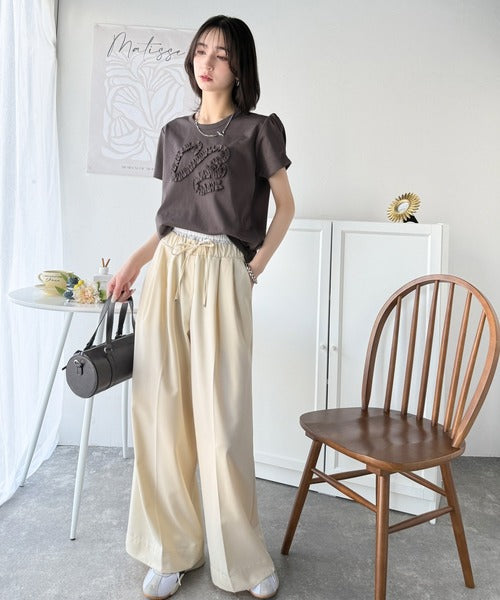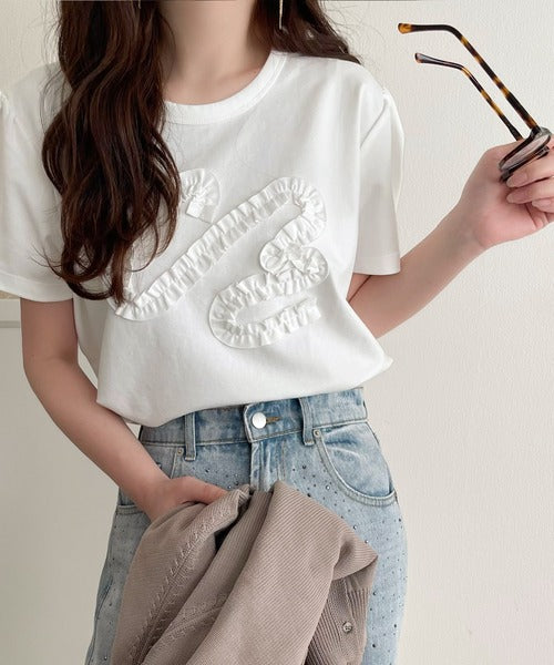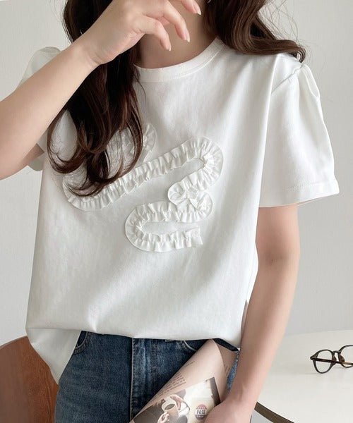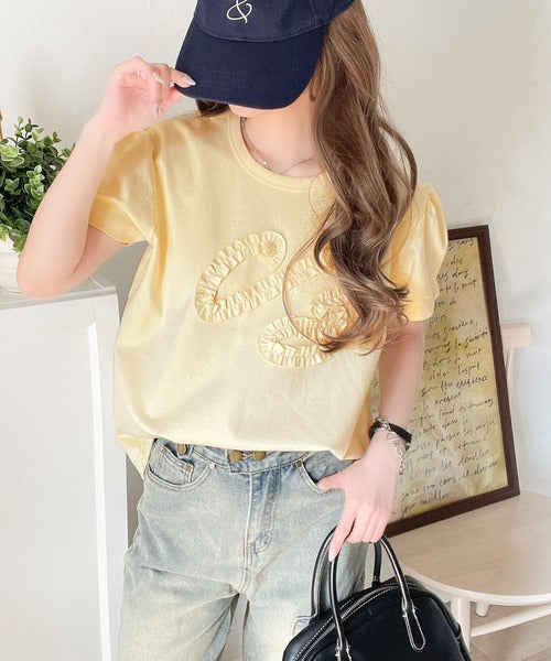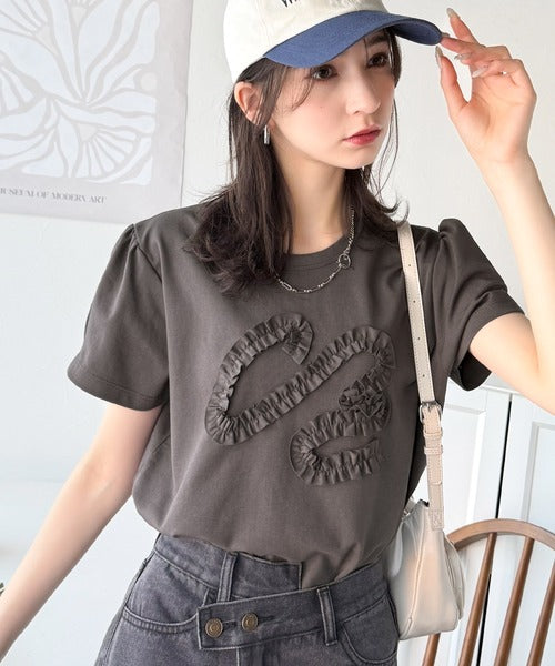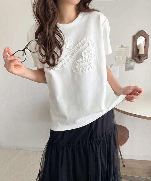 シンプルなTシャツに可愛らしさをプラスしたリボン刺繍デザイン。