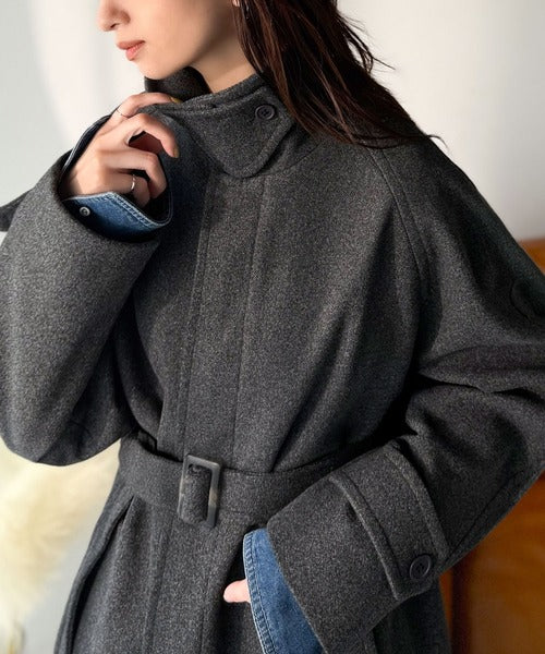 洗練された印象を与えるベルト付き比翼メルトンコート。