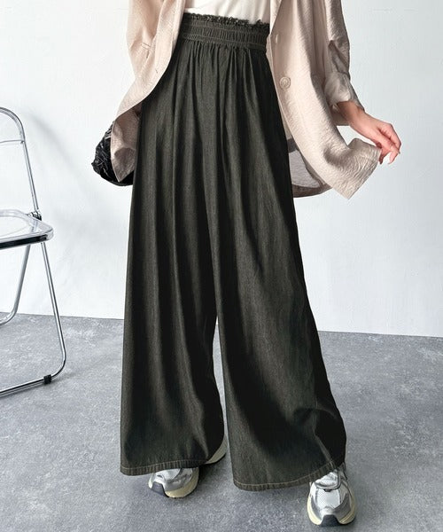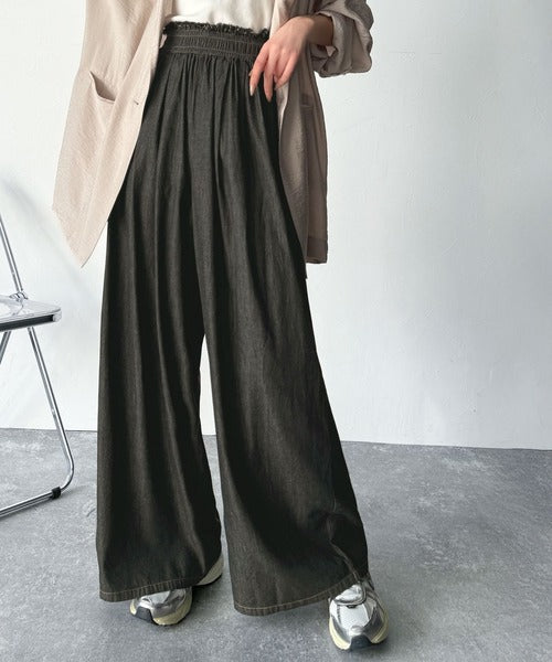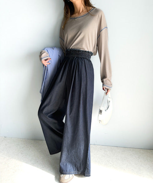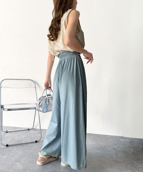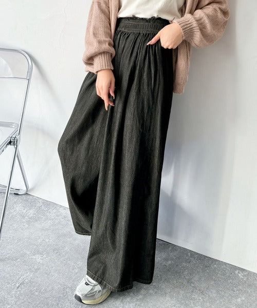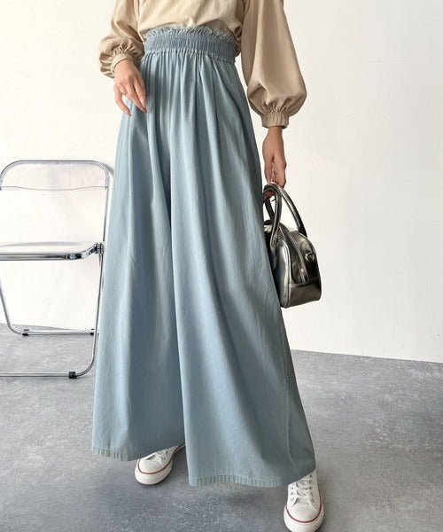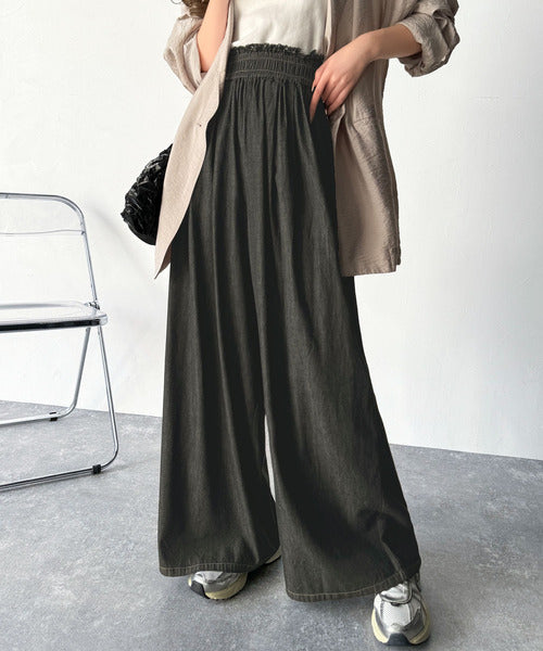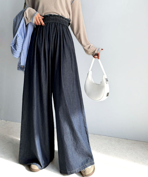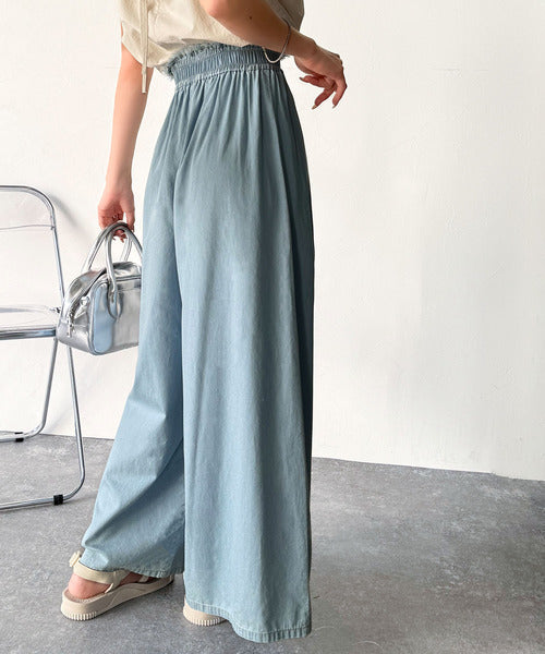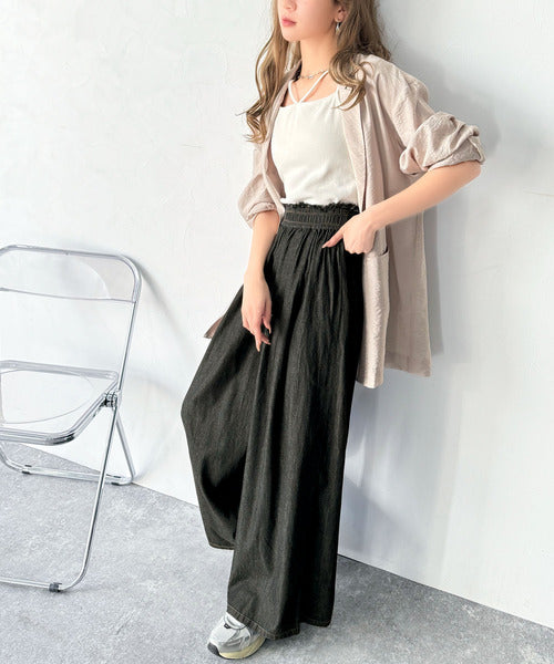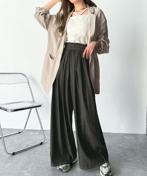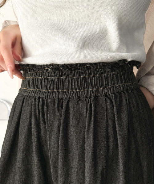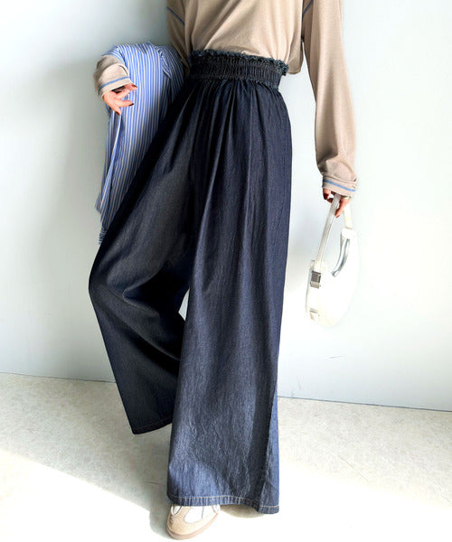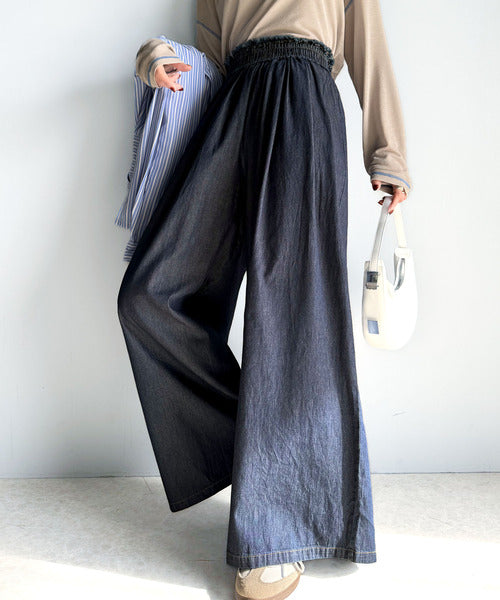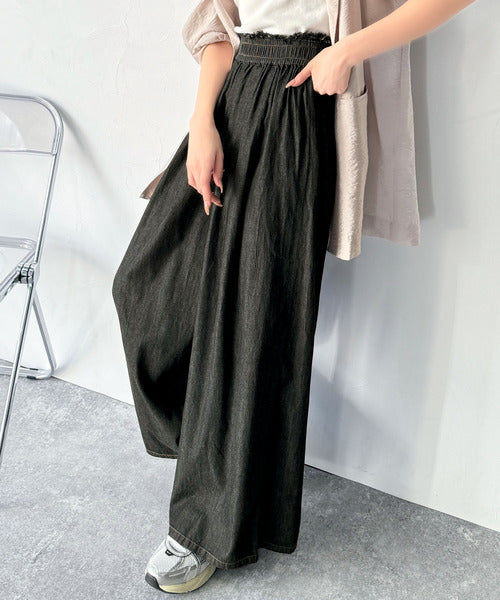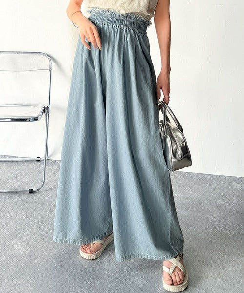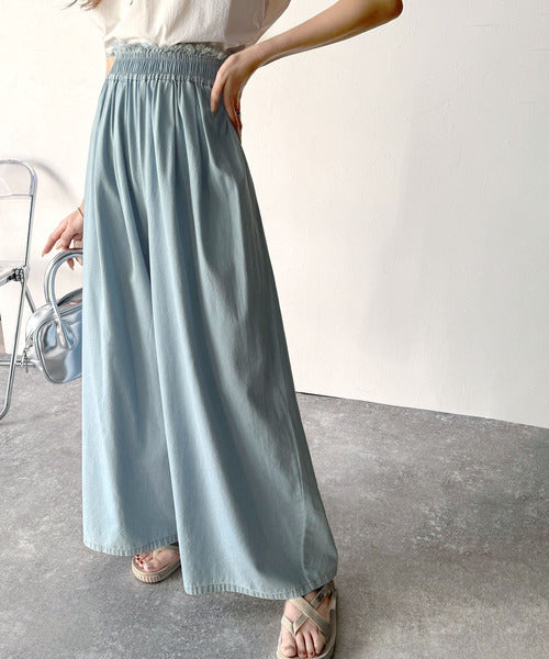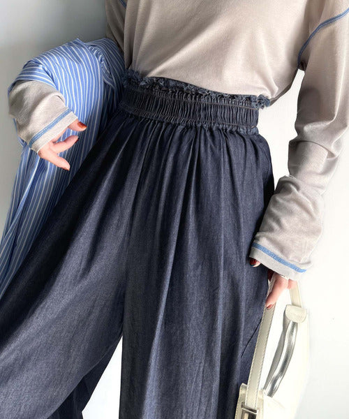 こなれカジュアルの決定版♪綿100%ライトオンスデニム素材ウエストフリンジワイドパンツ ce0940218