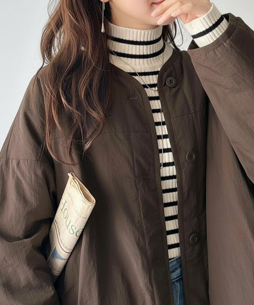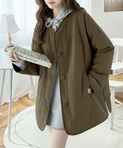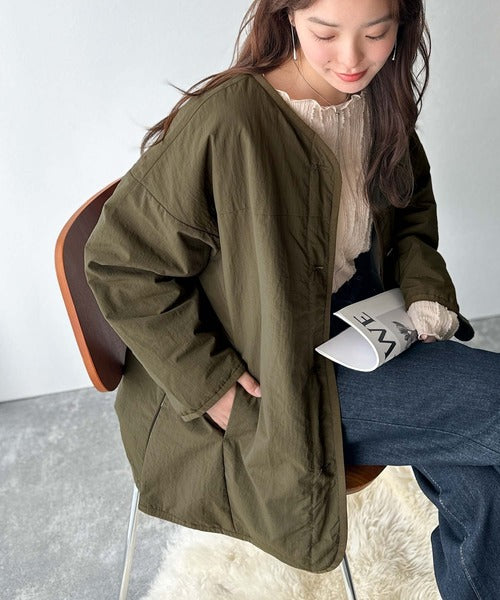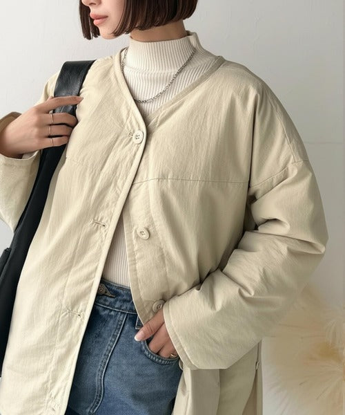 《JaVaジャバコラボ》1枚で今っぽい抜け感アウター。ノーカラーサイドファスナー中綿ジャケット jv1265013