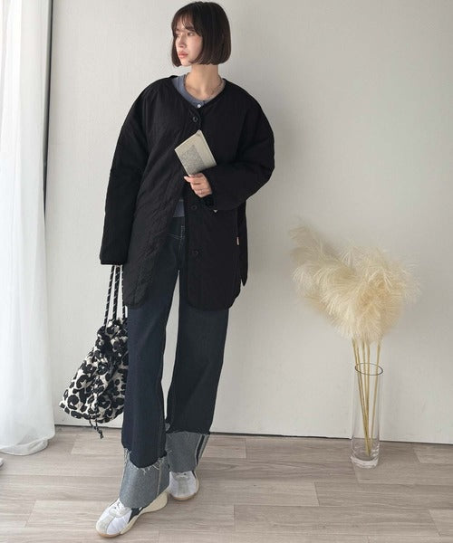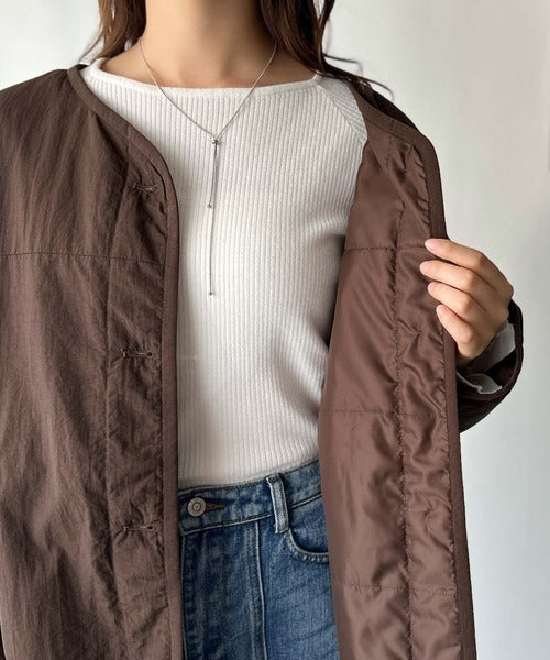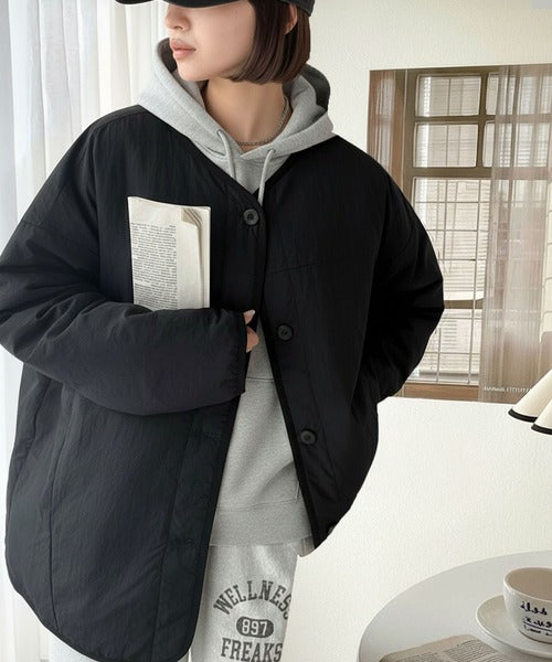 着るだけで今っぽく、かつシンプルに決まるノーカラー中綿ジャケット。