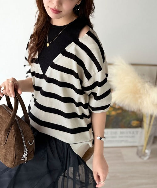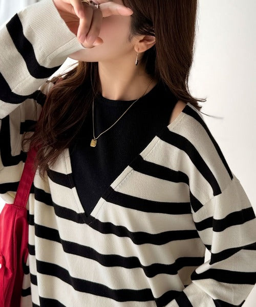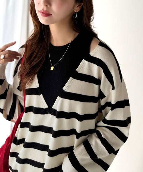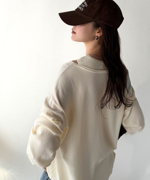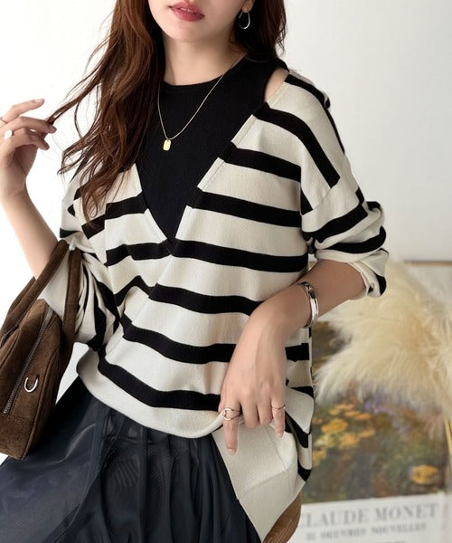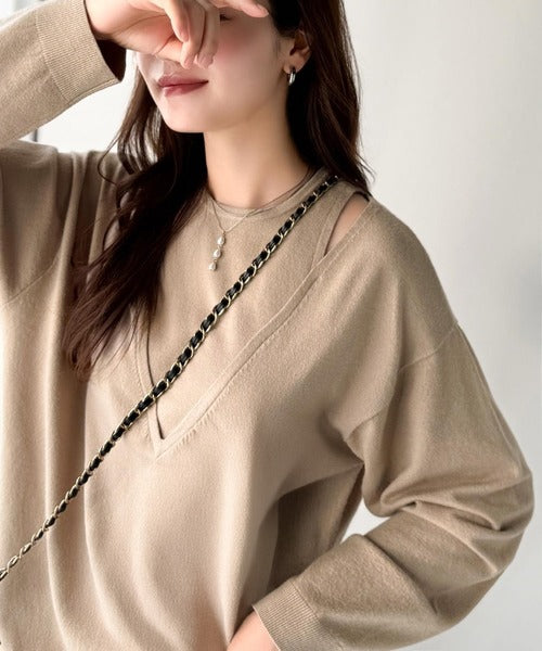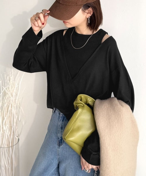 Vネックニットに、まるでタンクトップを重ねたようなレイヤード風デザイン。
