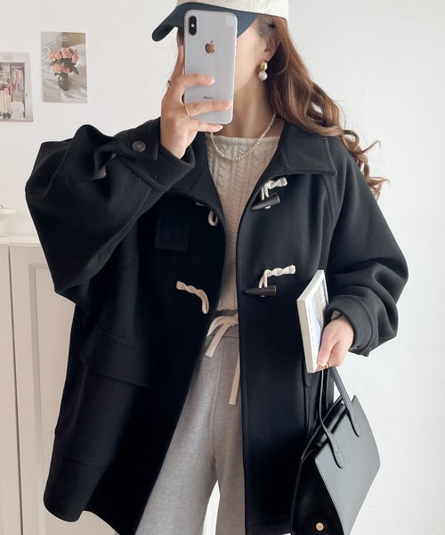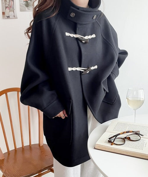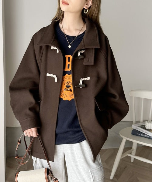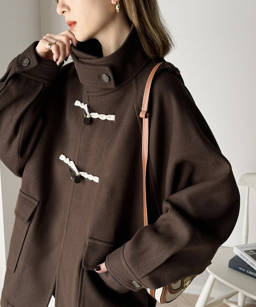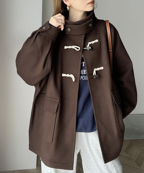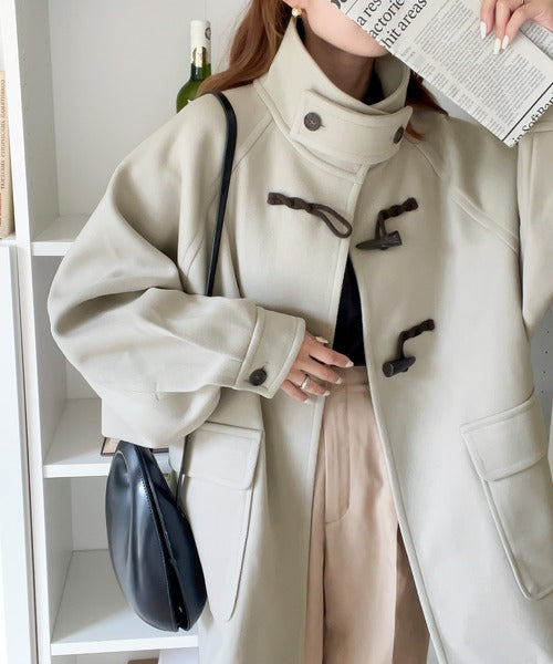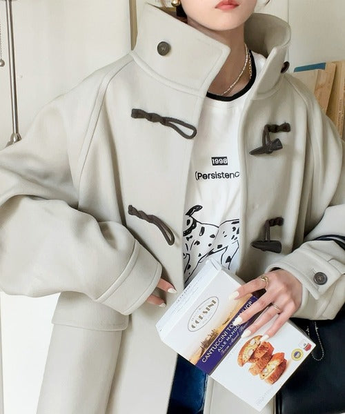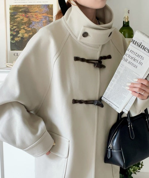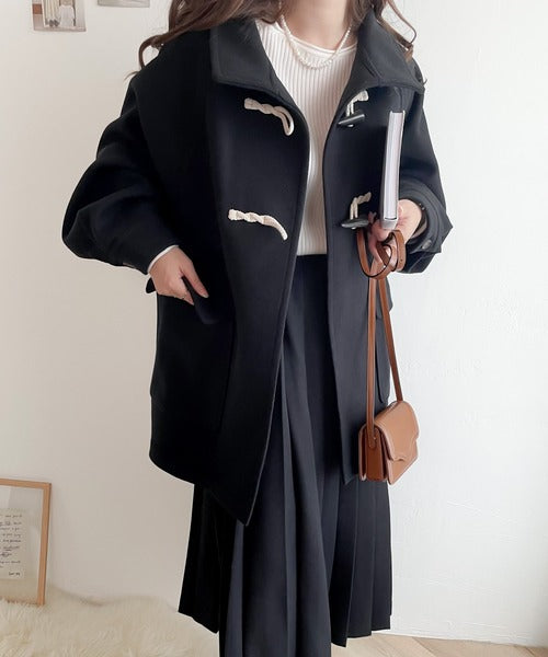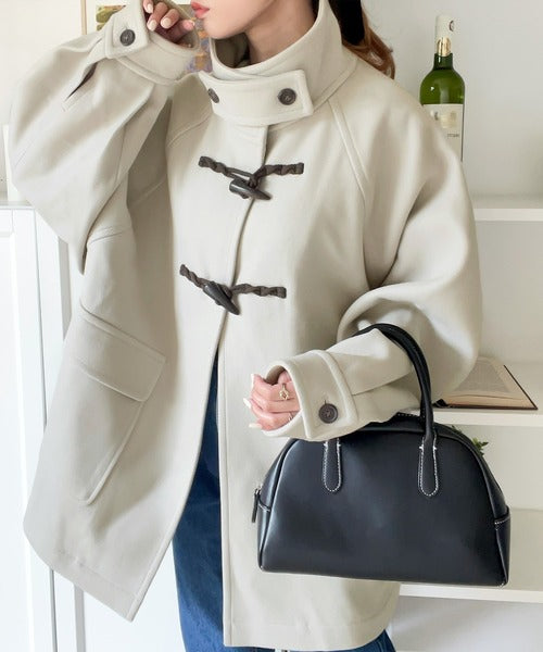 スタンドカラーでトラッドスタイルを演出する流行のダッフルコートにショート丈が登場。