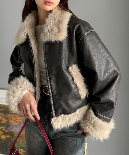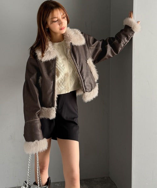 【mily bilet】季節を纏う。ファー使いヴィンテージライク ダメージフェイクレザーライダースジャケット mi1329065
