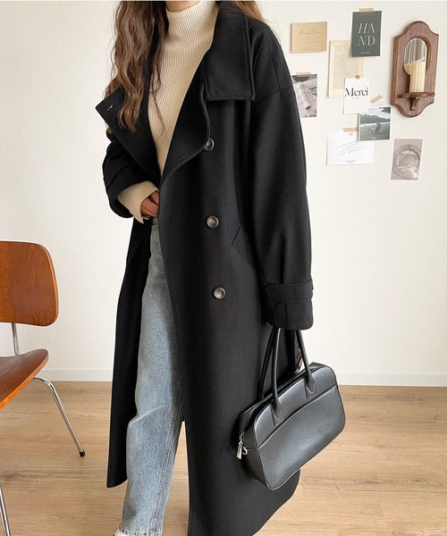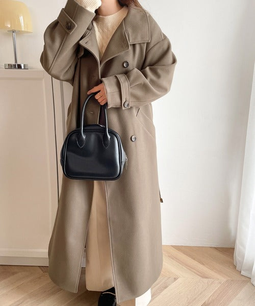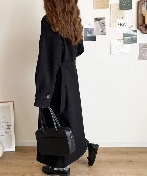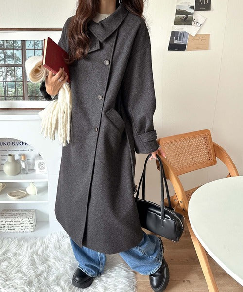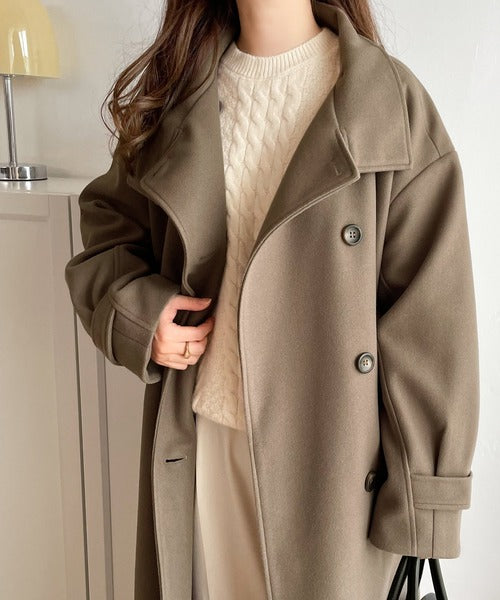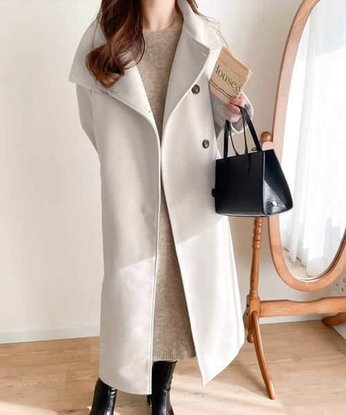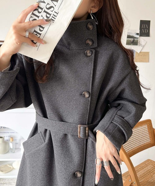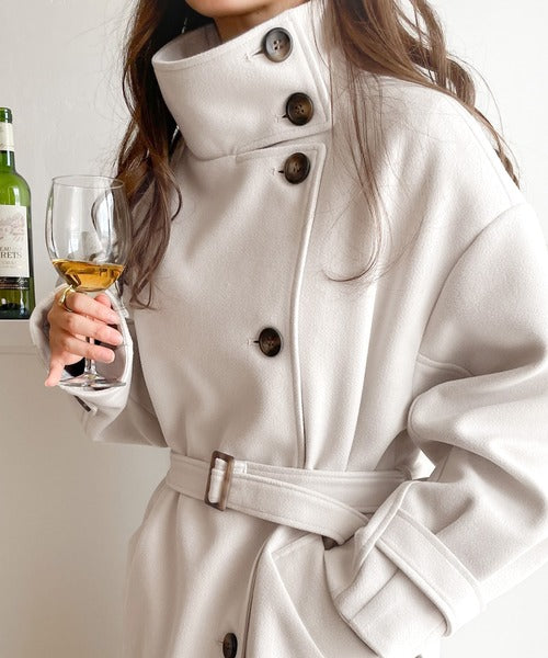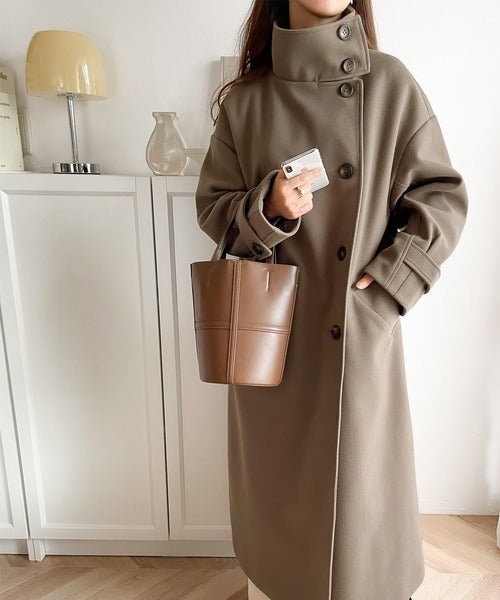 この秋冬トレンドのスタンドカラーロングコートです。